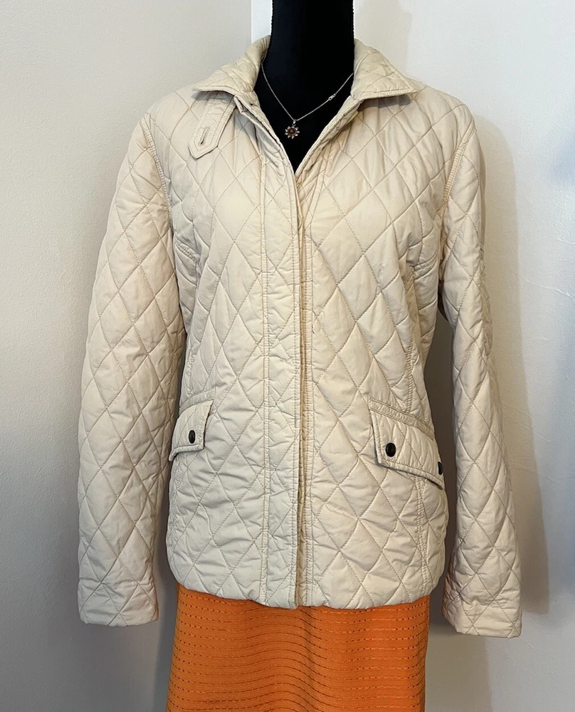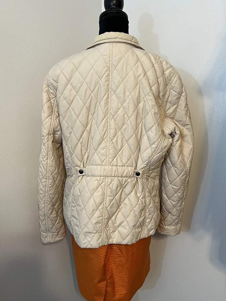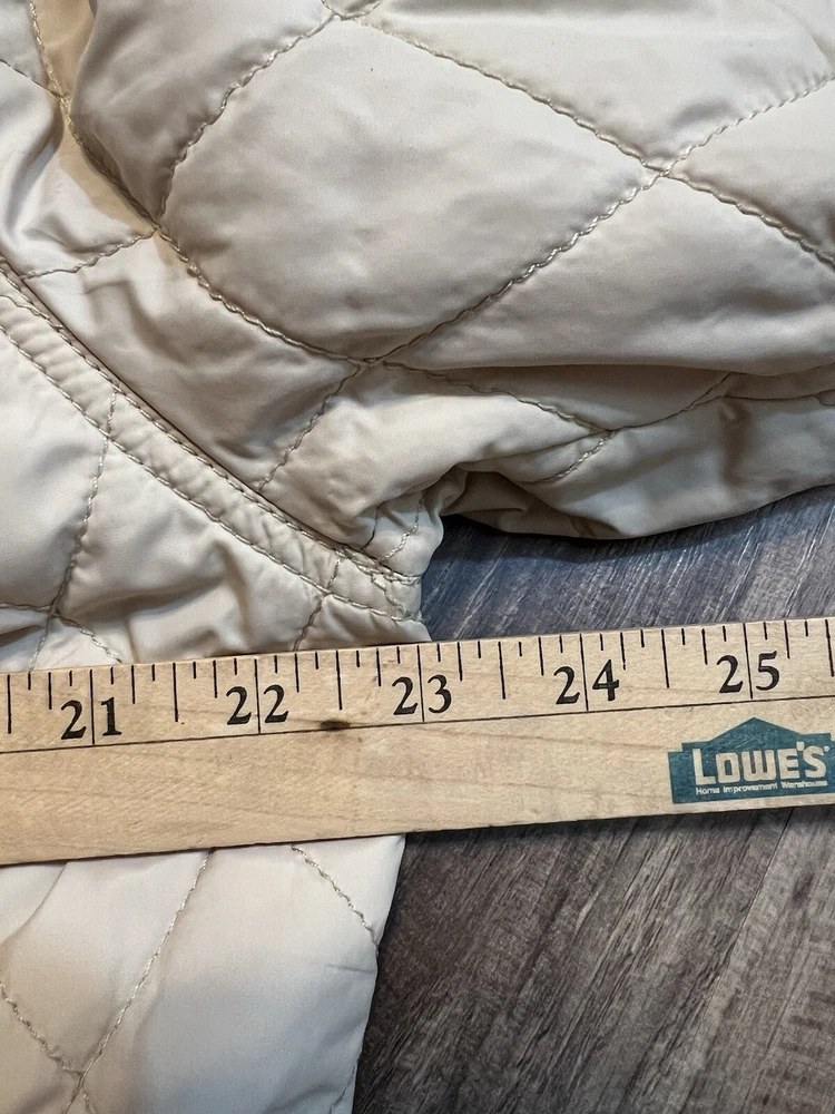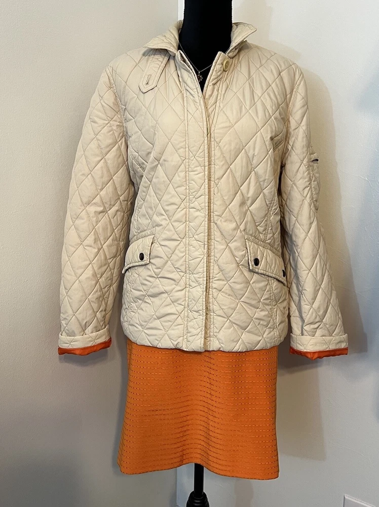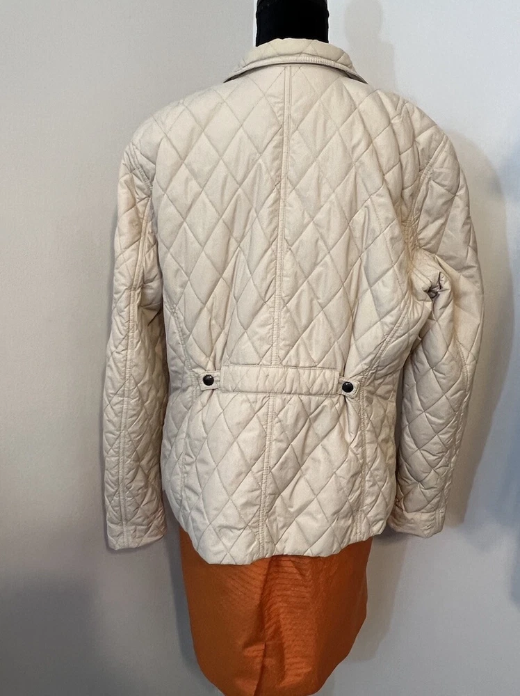 This vintage Tommy Hilfiger jacket is a must-have for any fashion-forward woman. The cream-colored coat features a diamond quilted pattern and is made from softshell polyester fabric. It has a full zip closure with buttons and accents that add a touch of elegance to the jacket. The mid-length coat is perfect for the fall, winter, and spring seasons and can be worn for various occasions, including travel, casual outings, workwear, and business meetings. The jacket is machine washable, making it easy to care for. The jacket is a classic fit and comes in size XL. The grandma-inspired theme makes it perfect for outdoor activities and preppy style. This is not thick like a winter coat. :-)