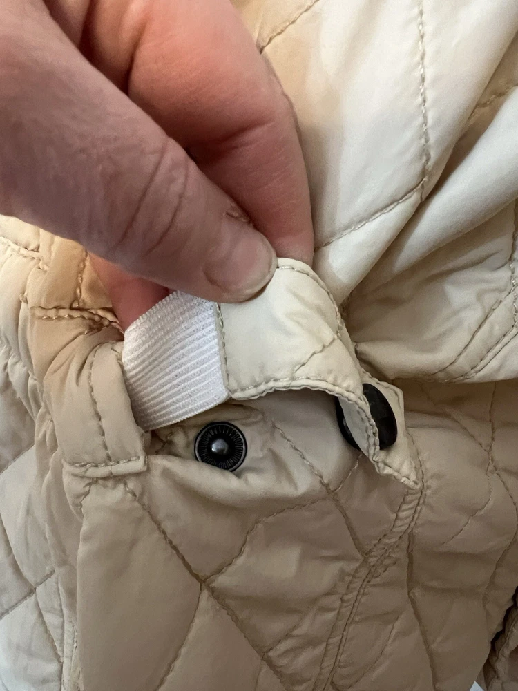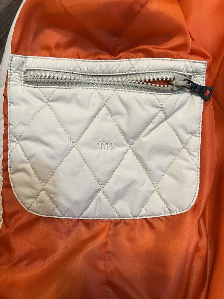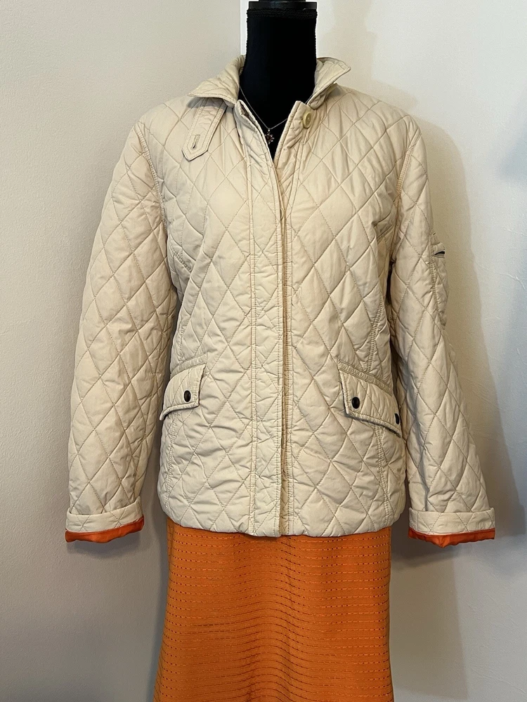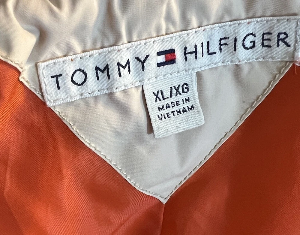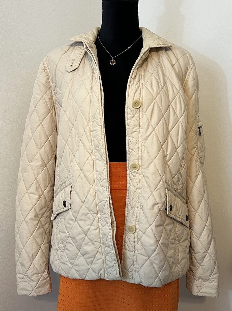 This vintage Tommy Hilfiger jacket is a must-have for any fashion-forward woman. The cream-colored coat features a diamond quilted pattern and is made from softshell polyester fabric. It has a full zip closure with buttons and accents that add a touch of elegance to the jacket. The mid-length coat is perfect for the fall, winter, and spring seasons and can be worn for various occasions, including travel, casual outings, workwear, and business meetings. The jacket is machine washable, making it easy to care for. The jacket is a classic fit and comes in size XL. The grandma-inspired theme makes it perfect for outdoor activities and preppy style. This is not thick like a winter coat. :-)