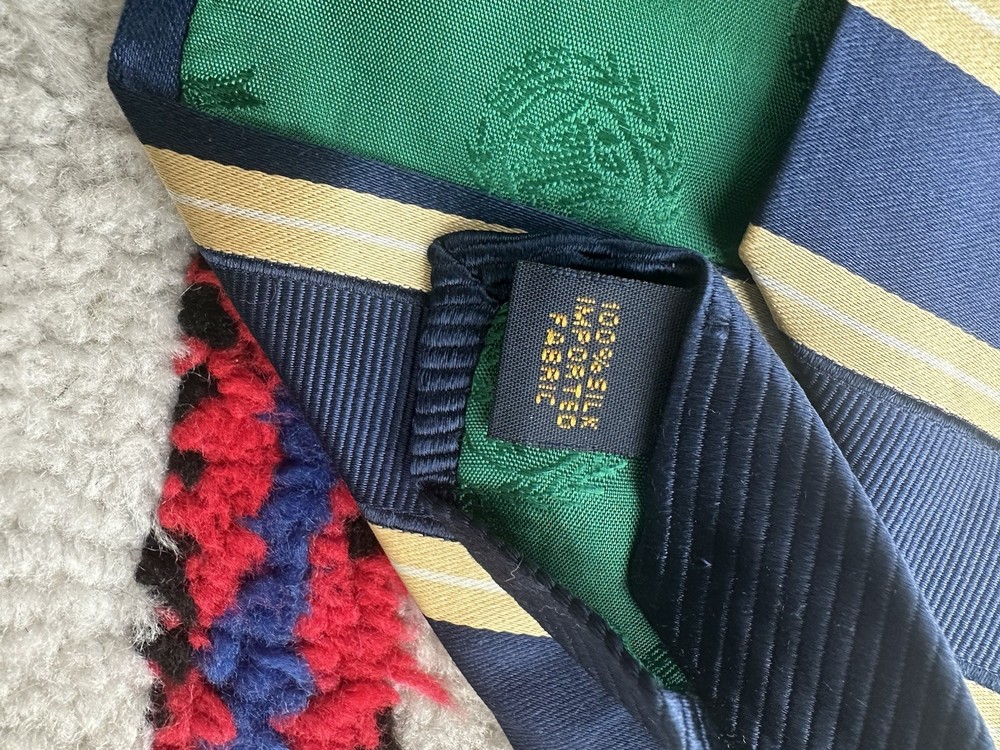This Vintage Tommy Hilfiger Men's Silk Classic Neck Tie is a stylish accessory made in the USA. It features a geometric yellow and blue pattern with the iconic Tommy Hilfiger logo accents. Crafted from 100% silk fabric, this wide tie has a pointed style and is adjustable for a comfortable fit around the neck. The classic length of 59 inches and 3.5-inch width at the tip make it a versatile piece that adds a touch of American heritage to any man's outfit.