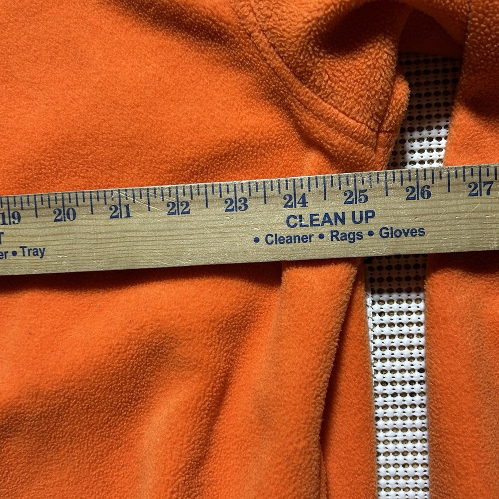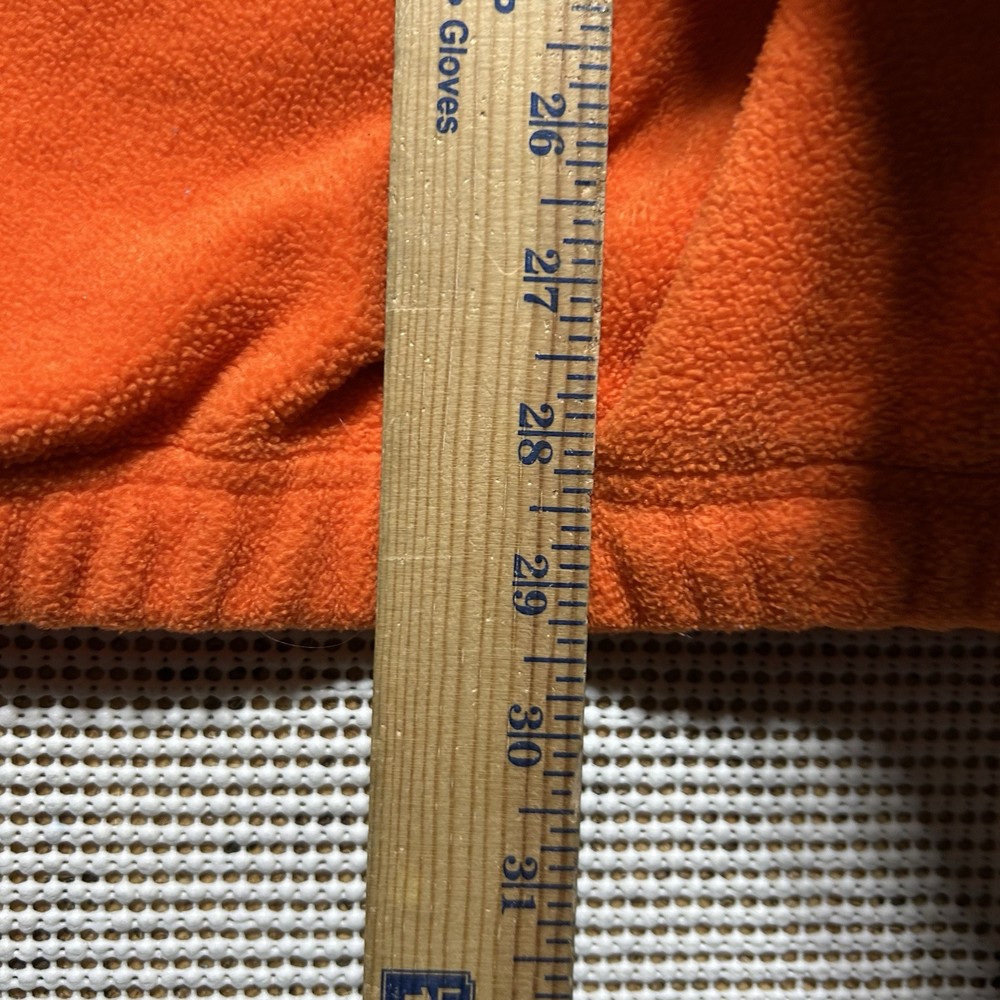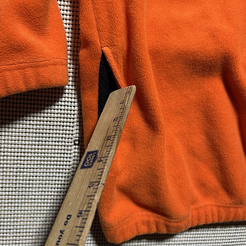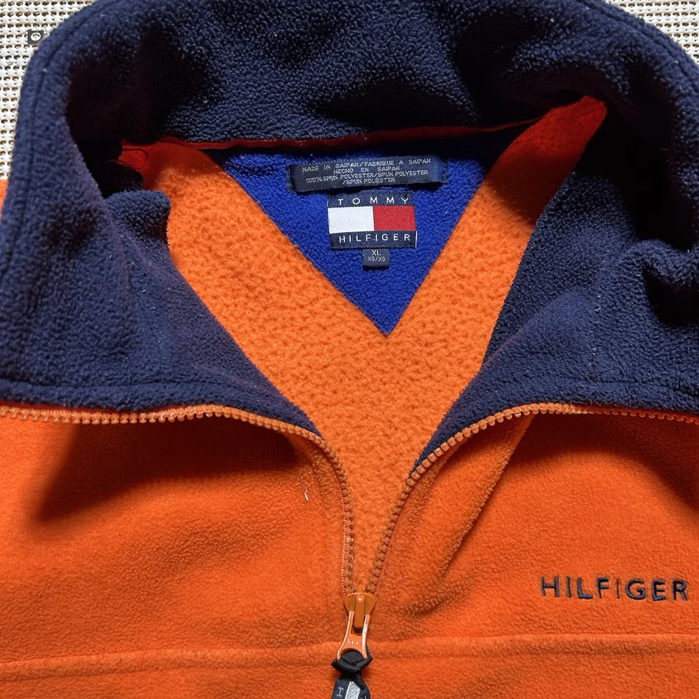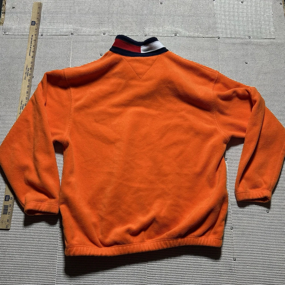This Tommy Hilfiger pullover is a vintage piece in bright orange fleece, featuring a 1/4 zip closure and a mock neck. The sweatshirt has long sleeves and a regular fit, making it comfortable for outdoor activities during the fall and winter seasons. With a retro 90s style and oversized design, this heavyweight sweatshirt includes pockets and the iconic Tommy Hilfiger logo accent. Made of polyester material, this pullover is machine washable and perfect for walking or hiking.