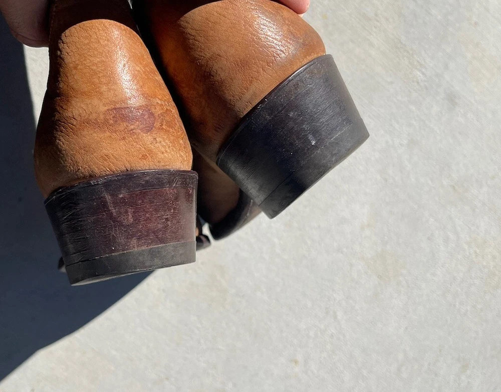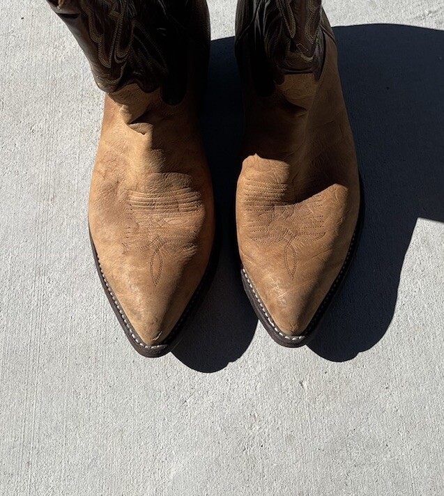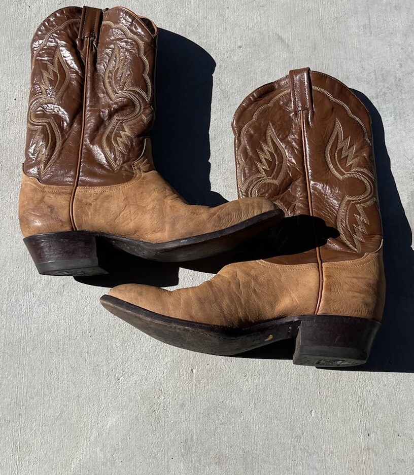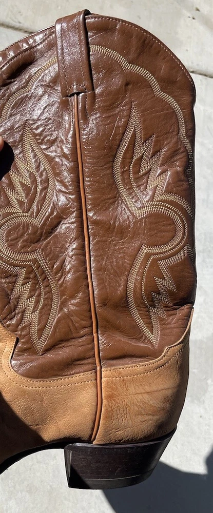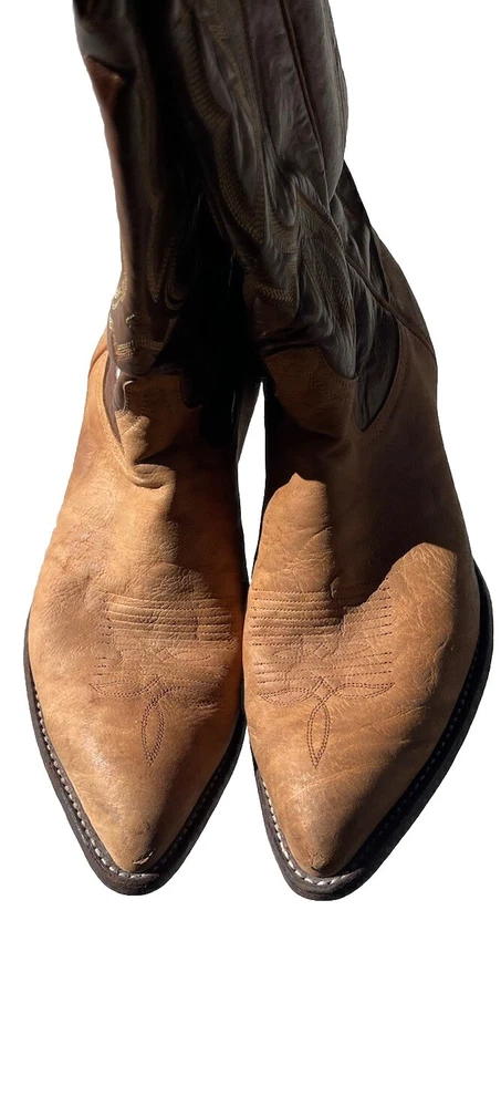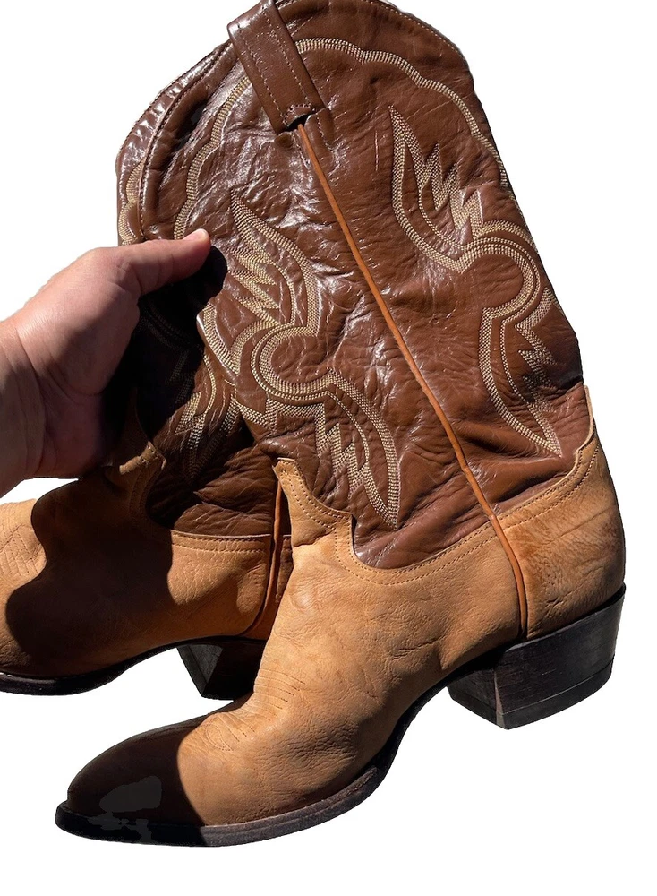 These vintage Tony Lama leather cowboy boots are a true gem for any western enthusiast. The dark brown and tan color combination, along with the men's size 9 fit, make them a perfect addition to any cowboy's wardrobe. The boots' outsole and upper material are both made of high-quality leather, ensuring both durability and style. The boots' brand, department, type, and model are all Tony Lama, men's, boots, and 1980s respectively. Their style is western, with a cowboy theme, and they were manufactured in the United States. These boots are perfect for anyone looking to add a touch of vintage style to their wardrobe.