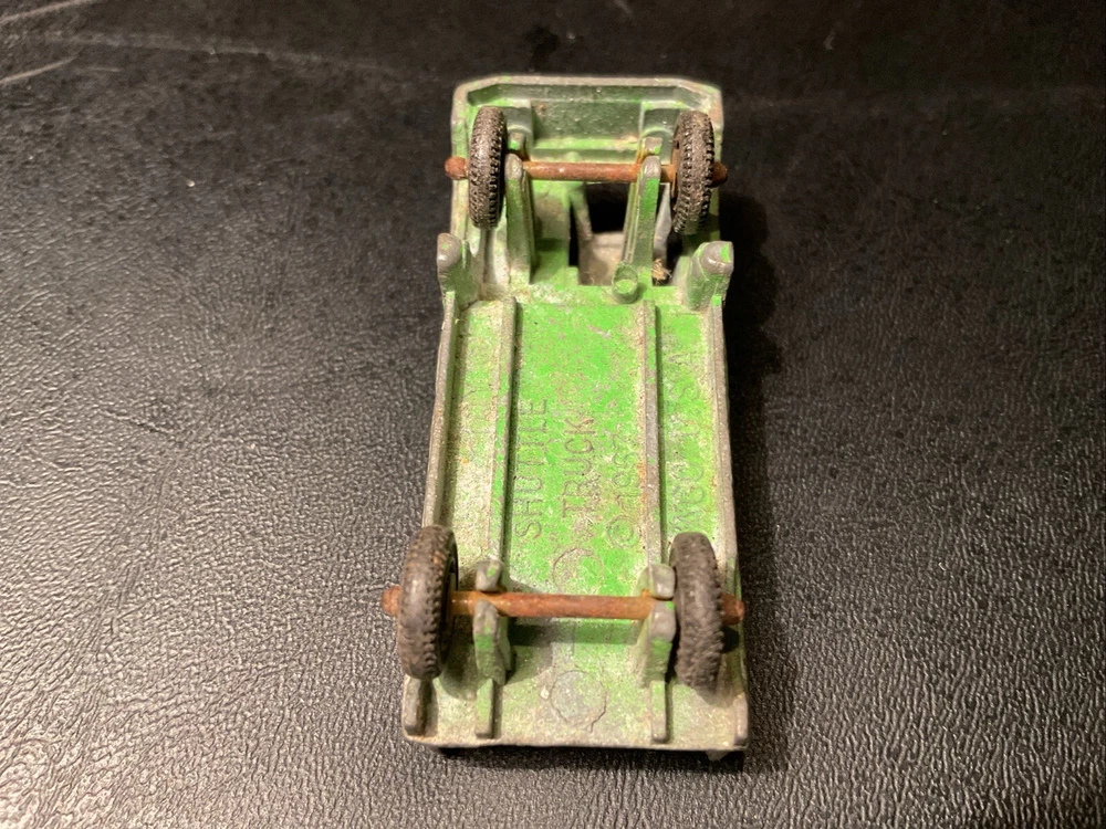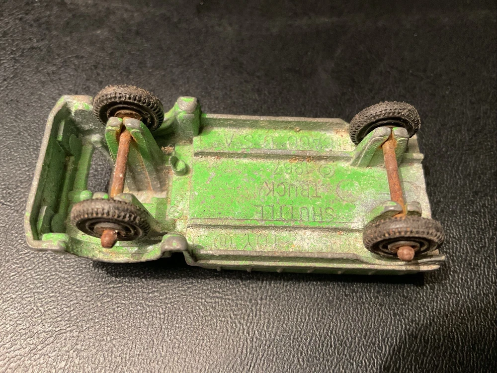 The product is a Vintage TootsieToy Shuttle Truck diecast car from 1967. It is a model of an El Camino truck in green color. This collectible toy was made in the United States by TootsieToy in Chicago, USA.