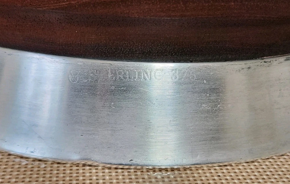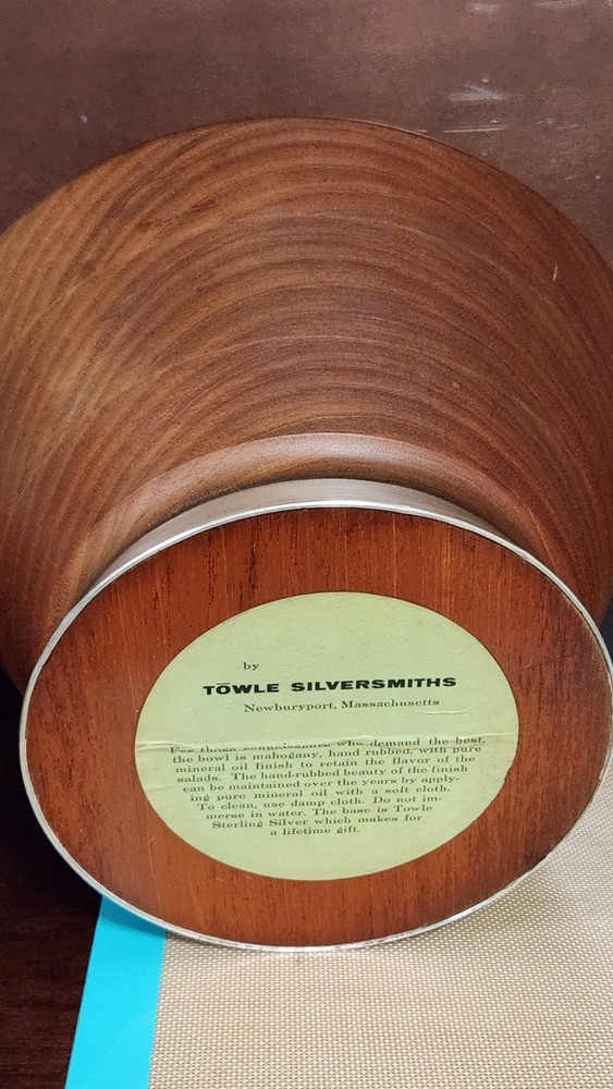 This Vintage Towle Large Wood Salad Bowl is a stunning piece of mid-century modern furniture. With a sterling silver base and a rich brown color, it exudes a timeless elegance that is sure to add a touch of vintage charm to any dining table. Made in America by the reputable brand Towle, this original piece is both functional and stylish, measuring 11 1/2" in diameter and 6 1/4" in height. Perfect for serving salads or as a striking decorative accent, this salad bowl is a versatile and unique addition to any antique collection.