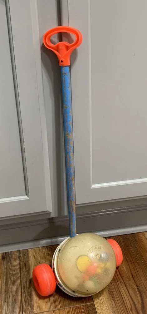 This vintage Fisher-Price Corn Popper Rolling Vacuum Toy is a classic, complete and made in the USA. It brings back memories of childhood with its brightly colored design and Popcorn Roller Ball character family. The toy is perfect for children aged 1-2 years or 12 months & under This vintage toy is used but it still rolls and pops! 😁 See photos for details.
