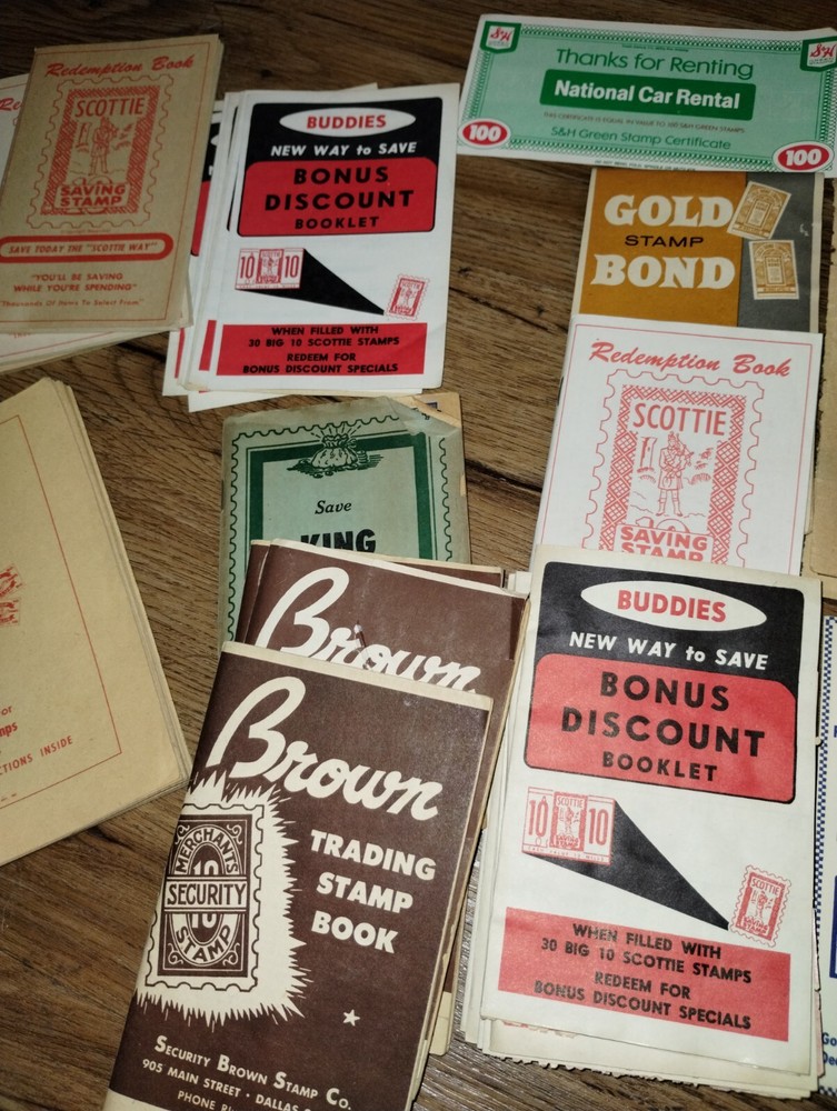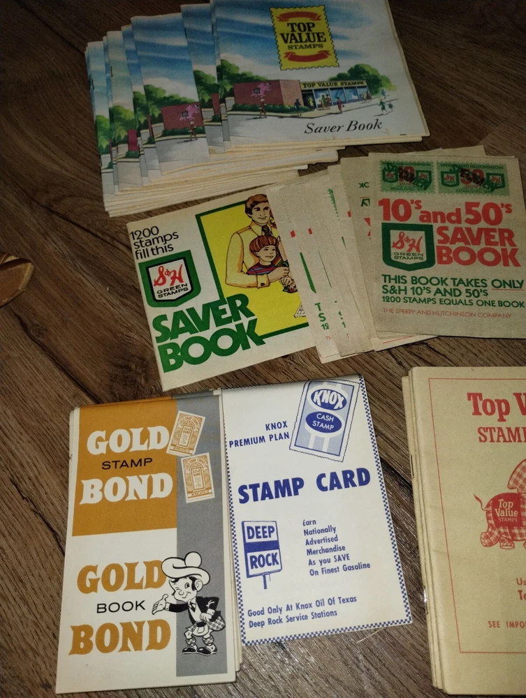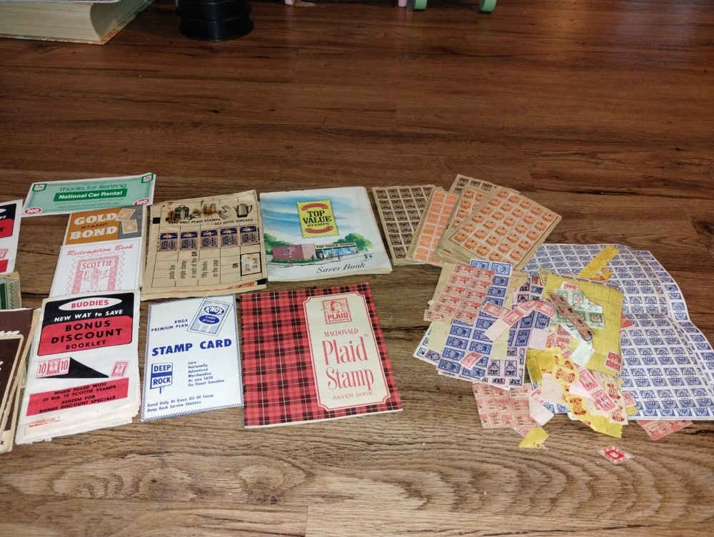 This is a large lot of miscellaneous vintage trade stamps, ideal for collectors who enjoy browsing through a variety of stamps from different companies that used to stamps for trade. The stamps are original gum and have been previously collected. The collection is ungraded, making it perfect for those who want to assess and value the stamps themselves. The lot includes a diverse array of trade stamps, providing a unique and fascinating glimpse into the past. It includes top value stamps, s&h Green stamps, Gold Bond stamps, top value stamps, buddies stamps, Brown trading stamps , and King thrift stamps. Some of them have full books and some have partially filled books. There is an entire lot of loose stamps and pages that have fallen out of previously filled books.