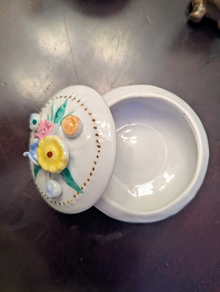 This vintage trinket box is a beautiful addition to any collection. The floral pattern on the top lid adds a touch of romance to any room. It is perfect for keeping jewelry or other small items safe and organized. The box is an original piece and has not been customized. It is suitable for display in any room and is a great piece for collectors of decorative items.