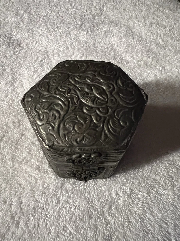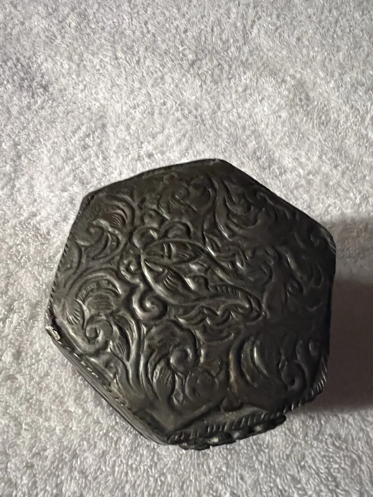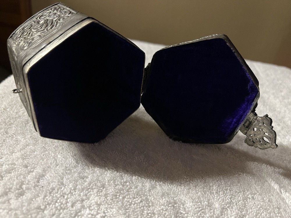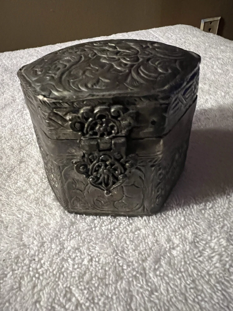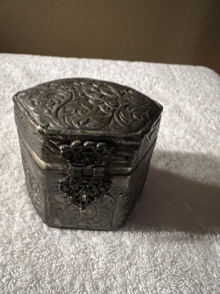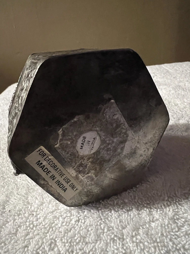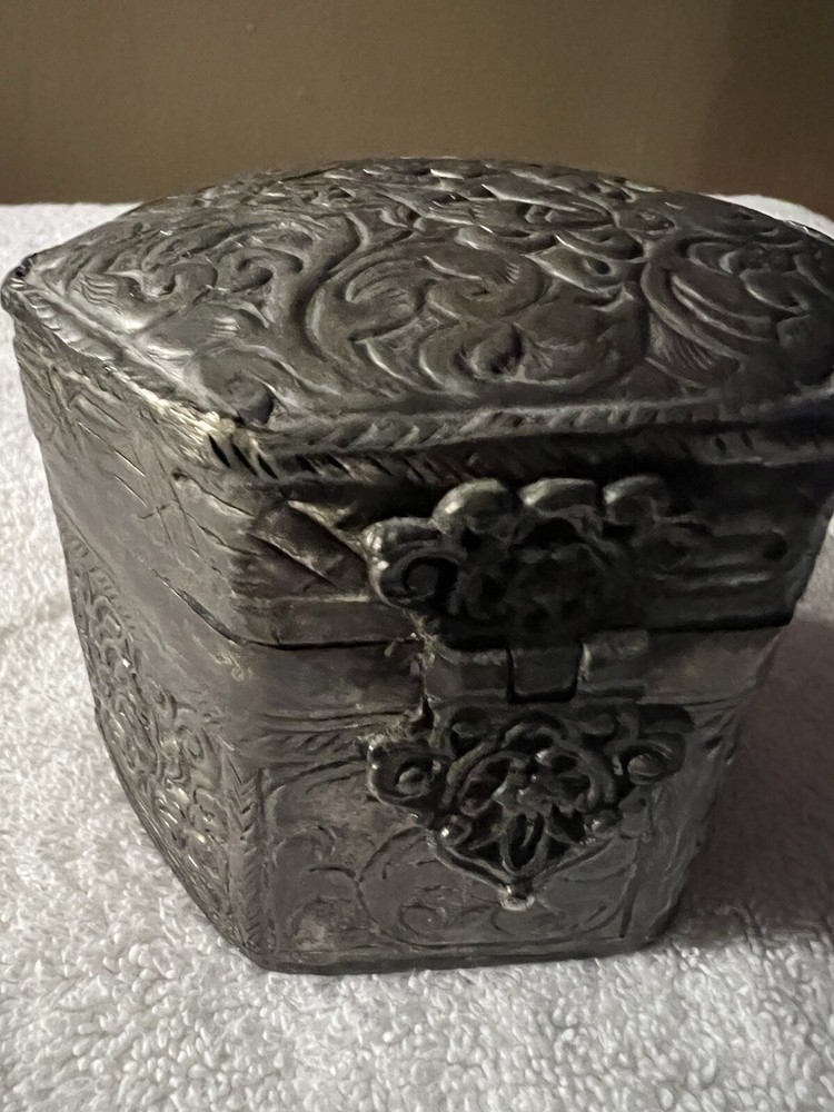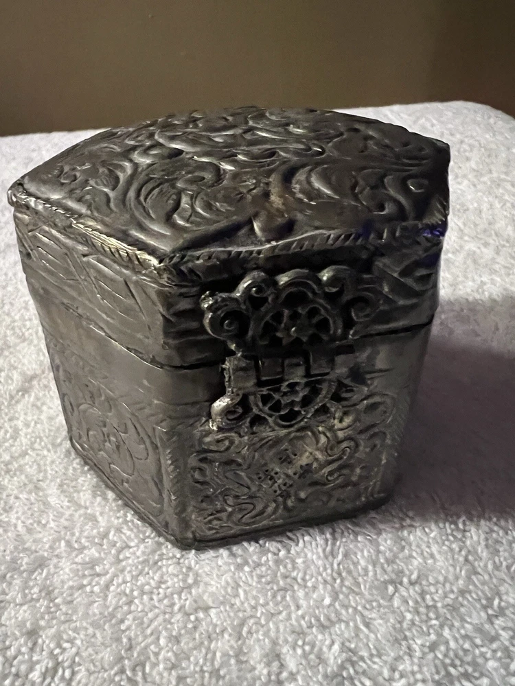 This vintage trinket box is a small square-shaped accessory crafted in India. The silver plated box features an embossed finish and exudes an Asian style. Perfect for keeping keepsakes safe, this decorative piece is sure to add a touch of elegance to any space. Made with quality materials and attention to detail, this trinket box from India is a unique and charming addition to any collection.