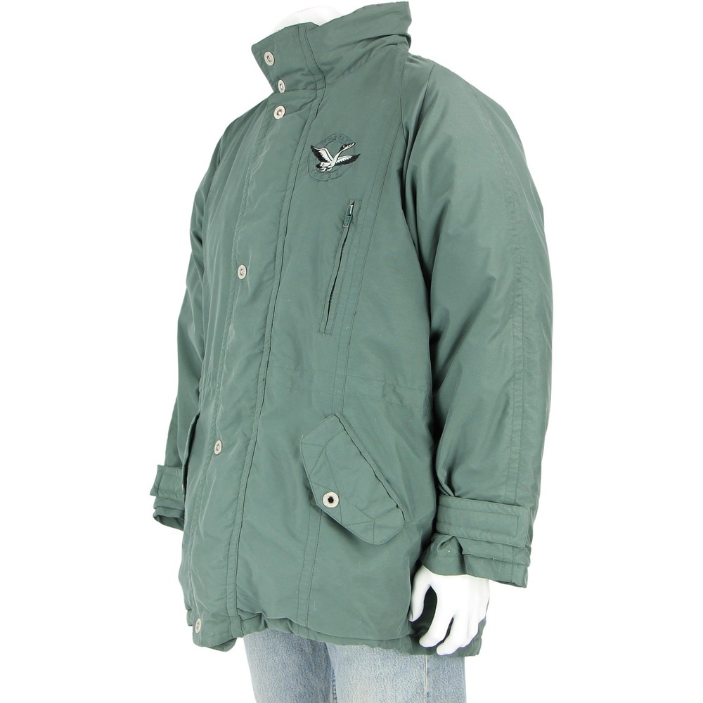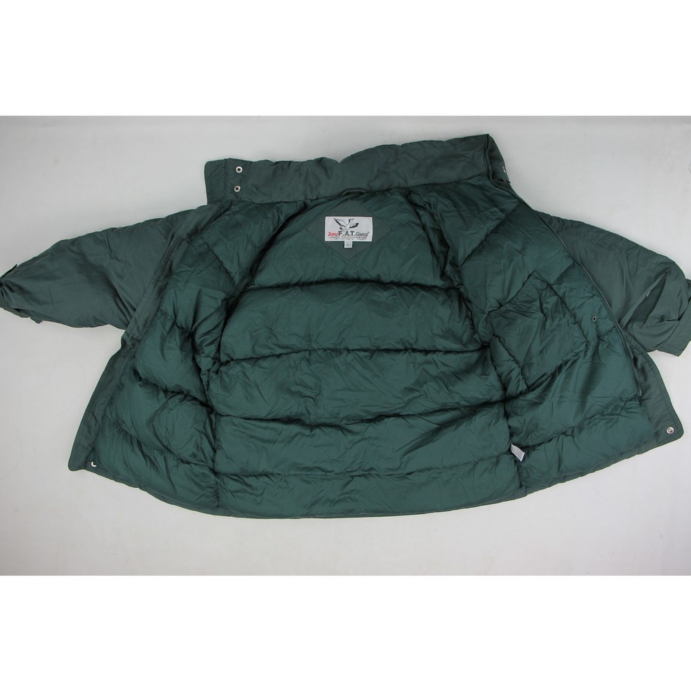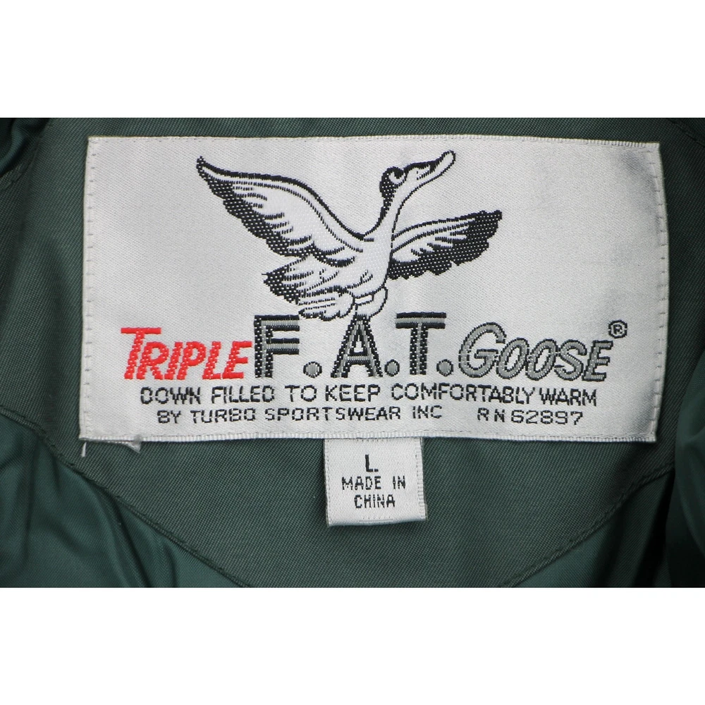 Dive into the vintage charm of this Triple F.A.T. Goose Down Parka, a perfect blend of urban chic and retro sport elegance. With its timeless green hue and high-fashion functionality, it's a staple for the modern vintage vogue. This coat offers unparalleled warmth and street style sophistication, making it the ultimate choice for the urban adventurer and style revivalist. Capture these moods: heritage outdoor, contemporary classic, casual luxury, iconic casualwear, sartorial staple, casual sophistication, fashion-forward legacy. material:shell:100% polyester, lining:100% nylon, filler:80% duck down 20% waterfowl Feathers made in China 9/10 size on tag:L armpit to armpit:27 length(top to bottom):33 collar to end of cuff:33 all measurements are in inches any major defect will be mentioned and/or photographed 15932 6j8g6