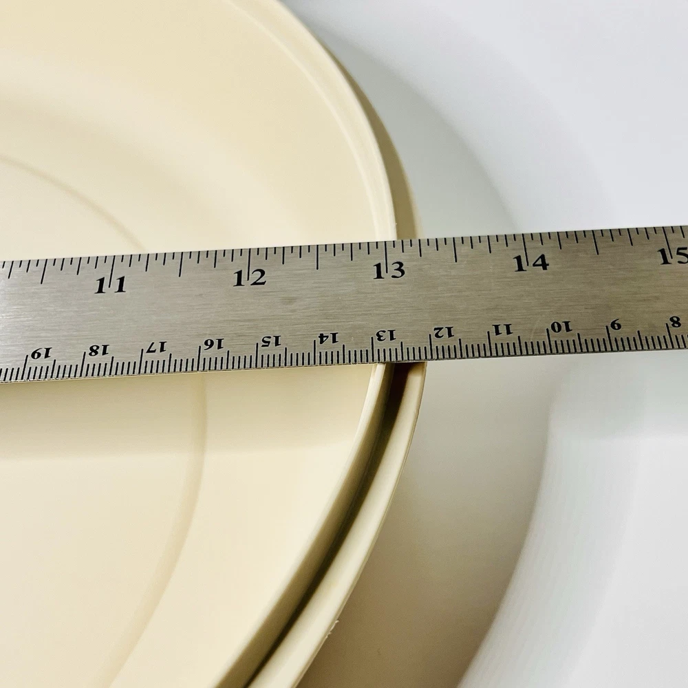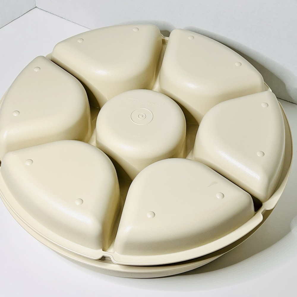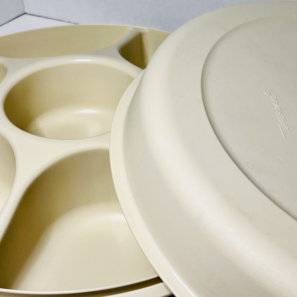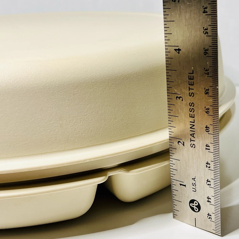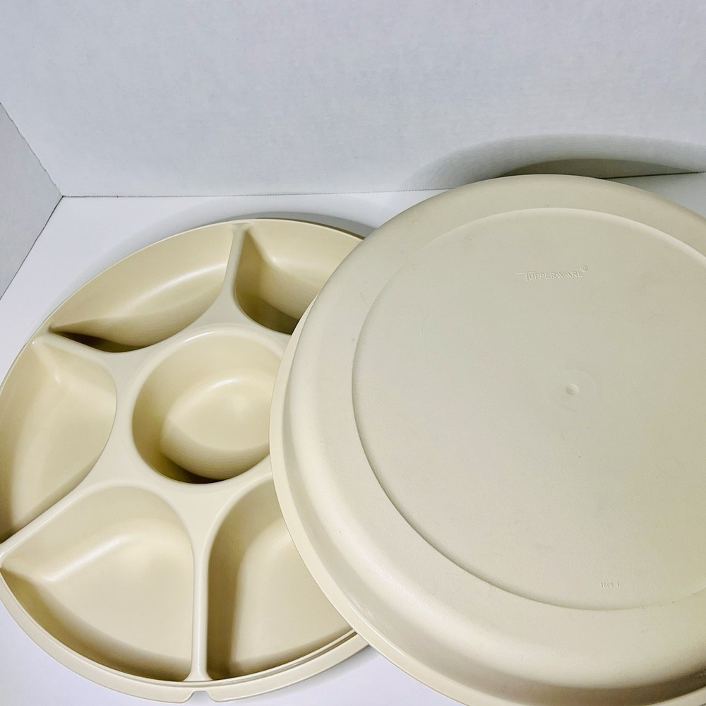 Item Height:4" with LidMPN:1665-5Number of Items in Set:2Pattern:SolidAntique:NoHandmade:NoItem Length:13.5"Style:Vintage/RetroShape:RoundFranchise:TupperwareItem Diameter:13.5"Number of Tiers:1Country/Region of Manufacture:United StatesNumber of Slots:7Number of Compartments:More Than 5Type:TrayCalifornia Prop 65 Warning:NAColor:BeigeNumber in Pack:2Size:LargeSet Includes:LidItem Depth:4”Item Width:13.5"Brand:TupperwareMaterial:PlasticOriginal/Licensed Reproduction:OriginalVintage:YesFeatures:With LidLid Type:Push On