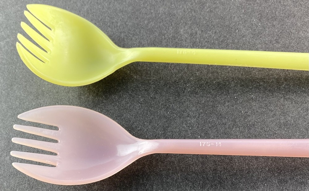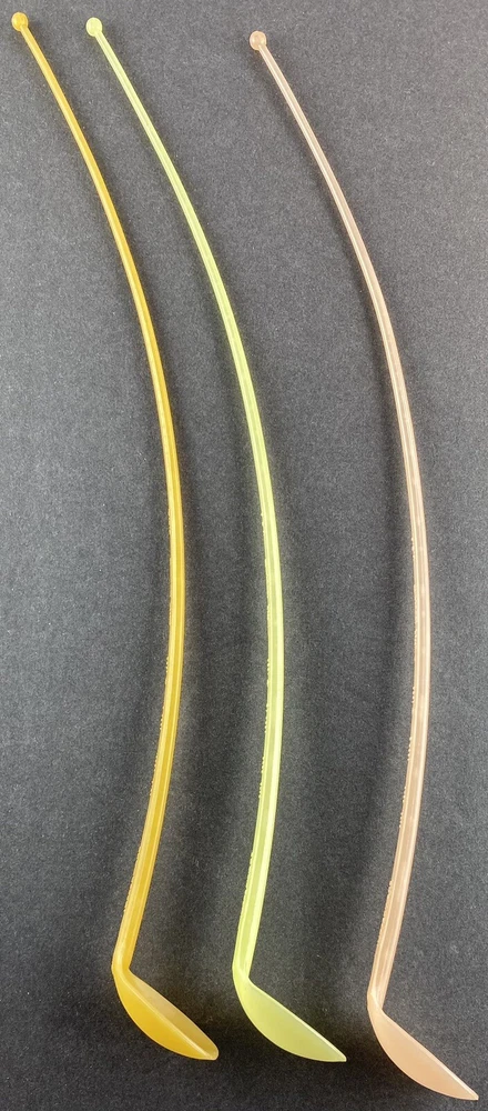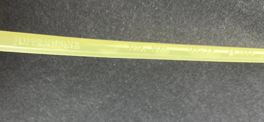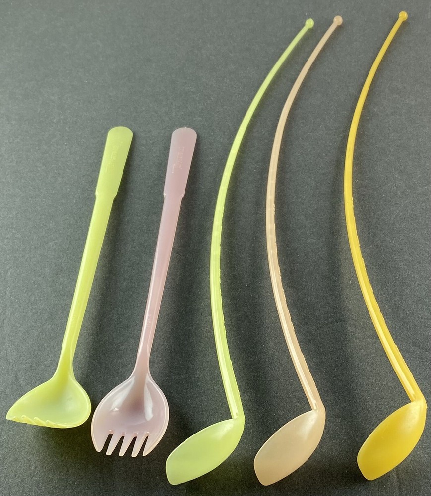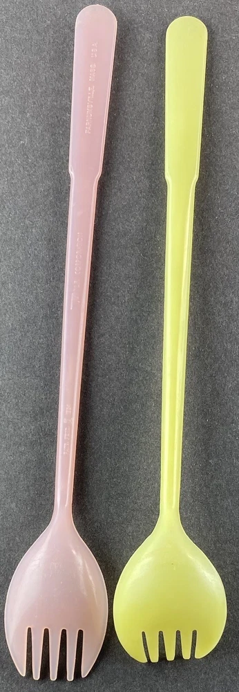 One spork is bent on the end, see photos. This vintage Tupperware silverware set includes a spork/fork and a spoon, both made of durable plastic material. The set is perfect for collectors or for everyday use, especially for those who prefer lightweight utensils. The handle of each utensil is also made of plastic for a comfortable grip. The set also comes with a long ice tea spoon, making it a complete package for any meal. Whether you're dining outdoors or indoors, this Tupperware silverware set is a great addition to your collection or kitchen.