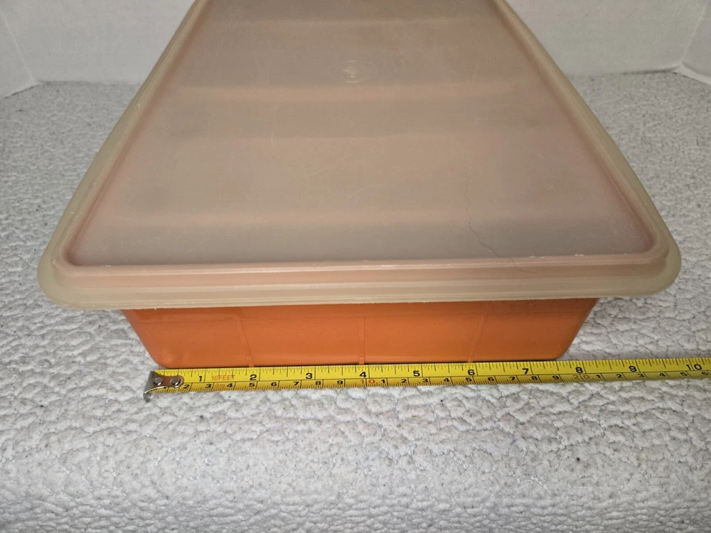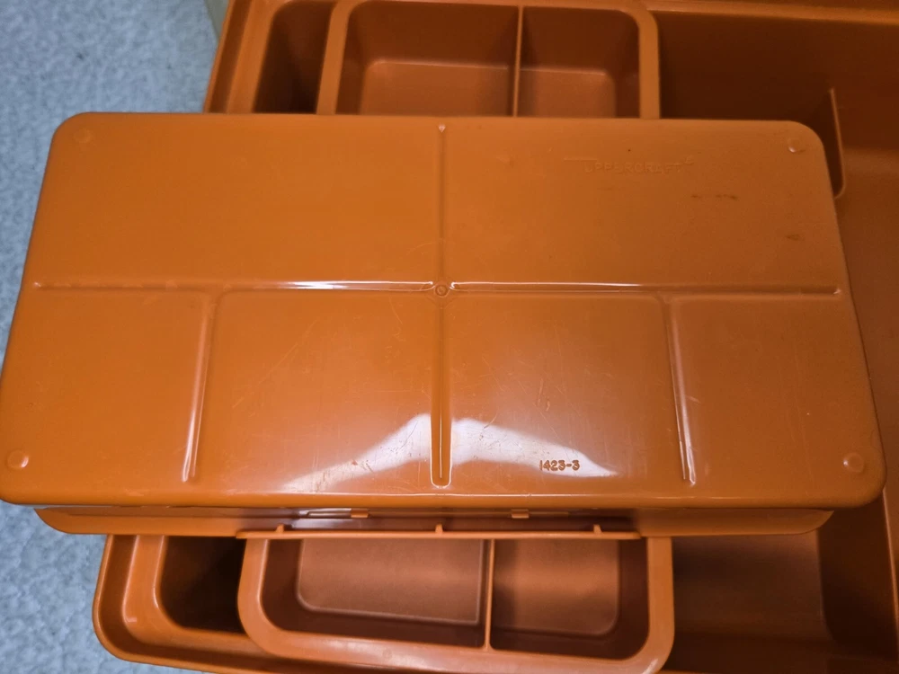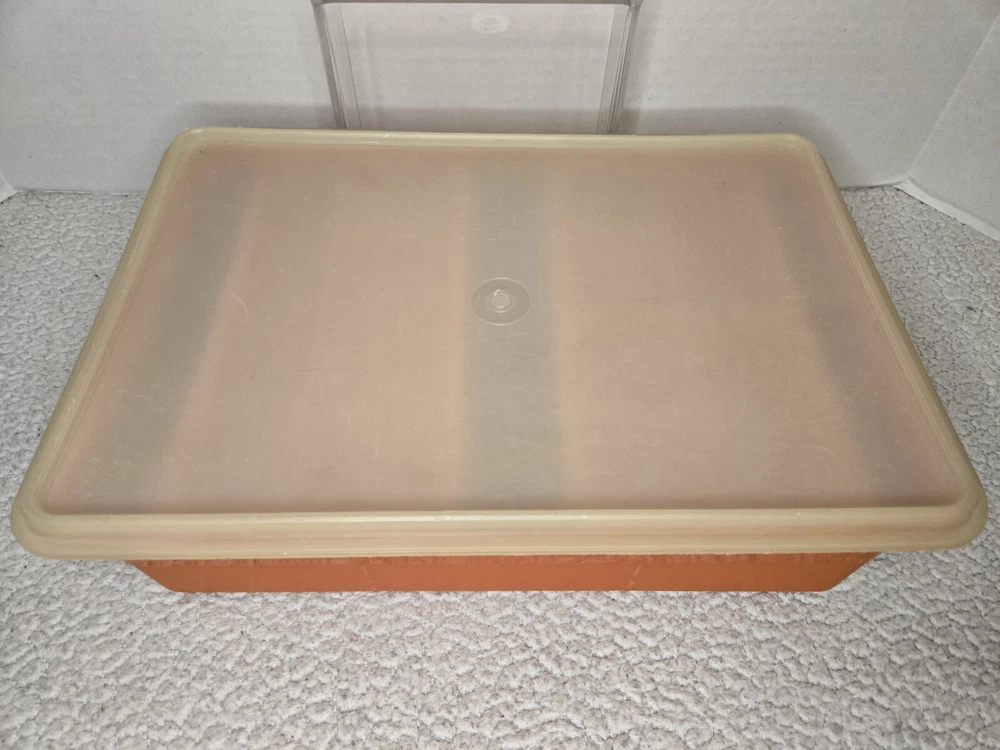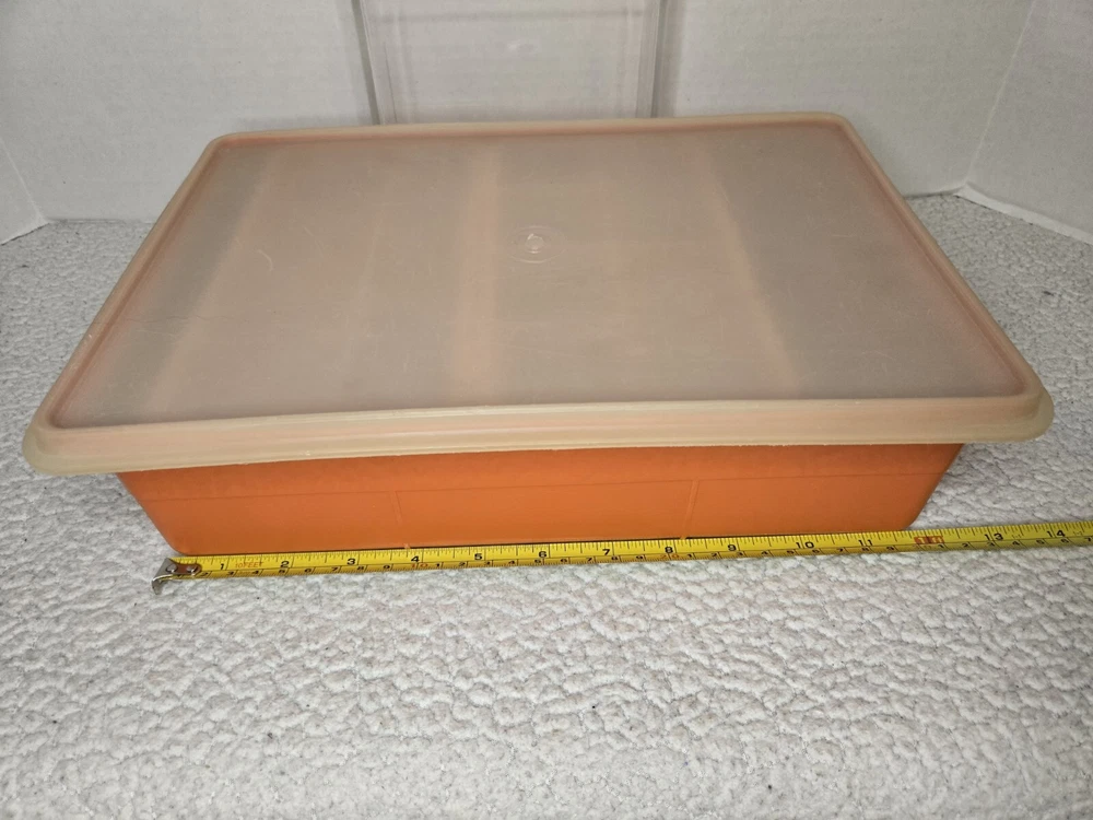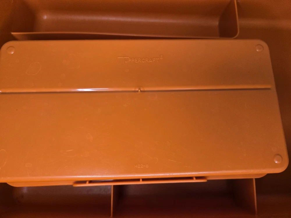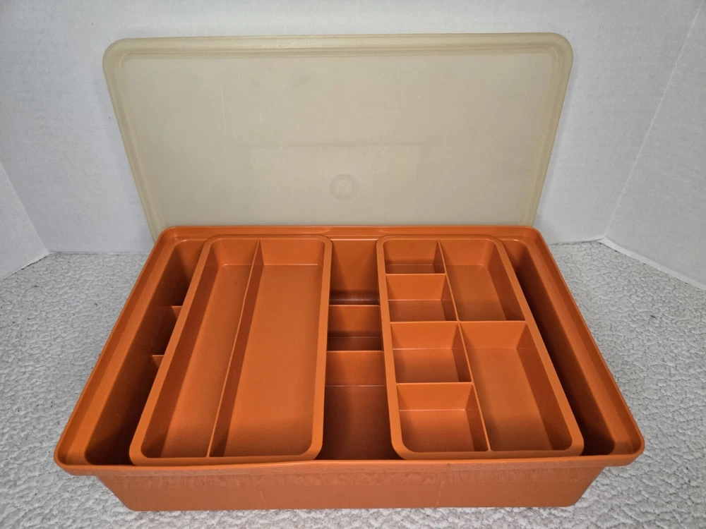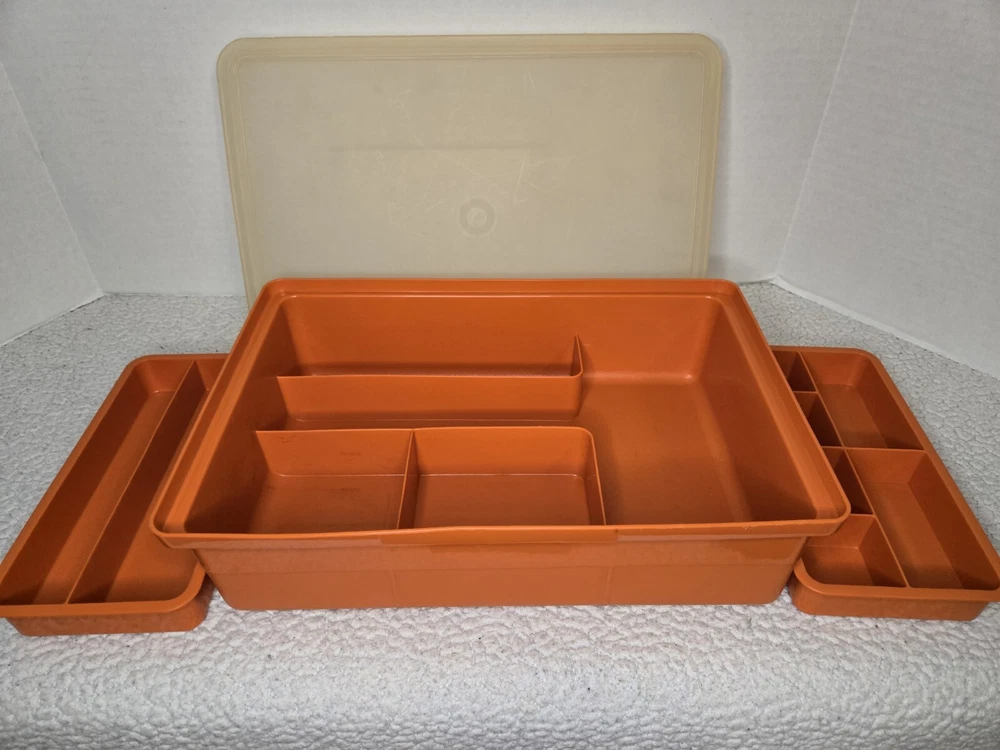 Tuppercraft set is in good used condition and was closely inspected, washed, cleaned and tested. See pictures for full details! Elevate your kitchen storage with the charm of vintage Tupperware. This 4-piece set, model 1421-4, comes in a vibrant burnt orange hue that adds a touch of retro flair to your organization. Each piece measures 12 inches in length and 8 inches in width, offering a spacious solution for your kitchen needs. Crafted in the United States during the 1970s, the set is a testament to classic design and durability. It features a robust plastic construction, complemented by a secure lid to keep your items fresh and safe. The set includes four reusable inserts, making it easy to categorize and quickly find contents. The easy-clean surfaces and 13 convenient slots make this Tupperware set a practical addition to any kitchen collection.