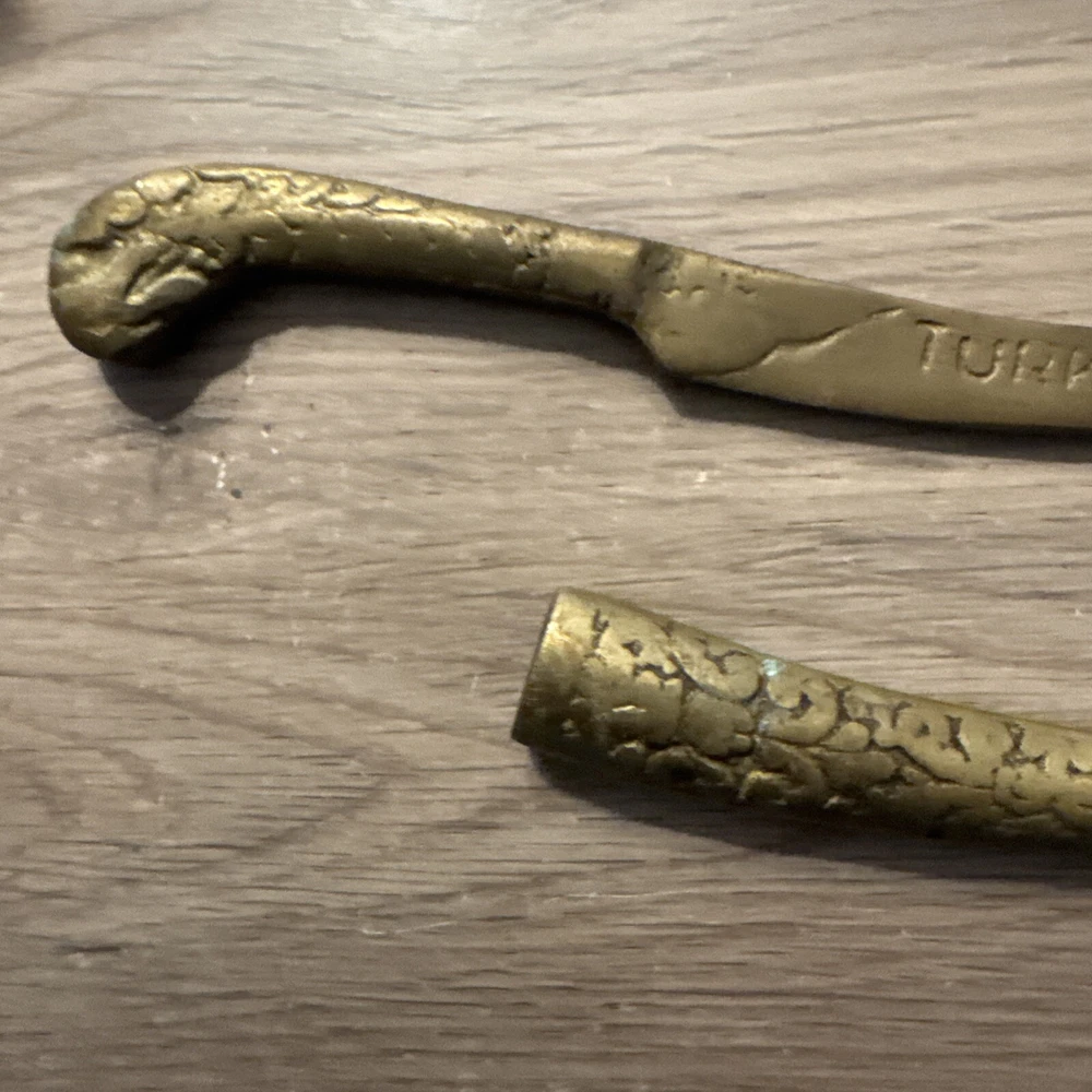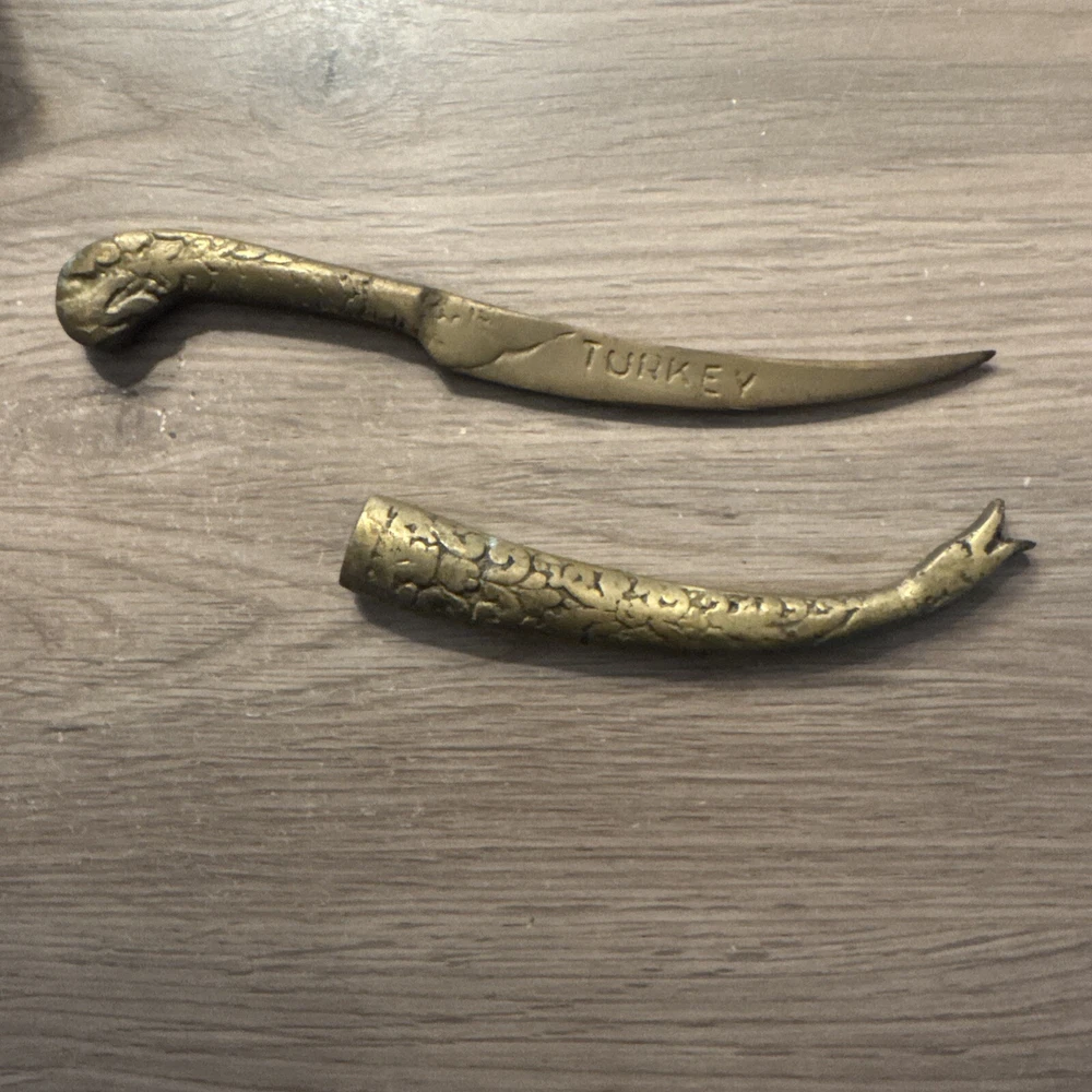 This vintage Turkish letter opener features a blade with a snake/serpent design, made of brass and marked with Turkish craftsmanship. It is a handmade item that comes with a sheath for storage.