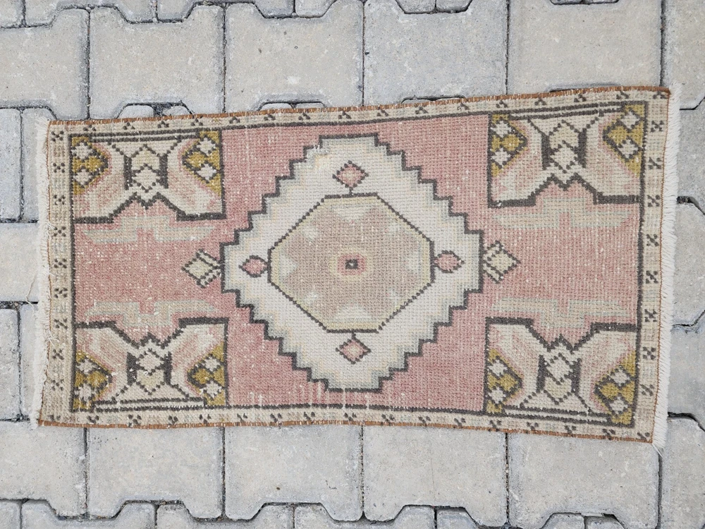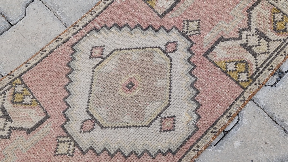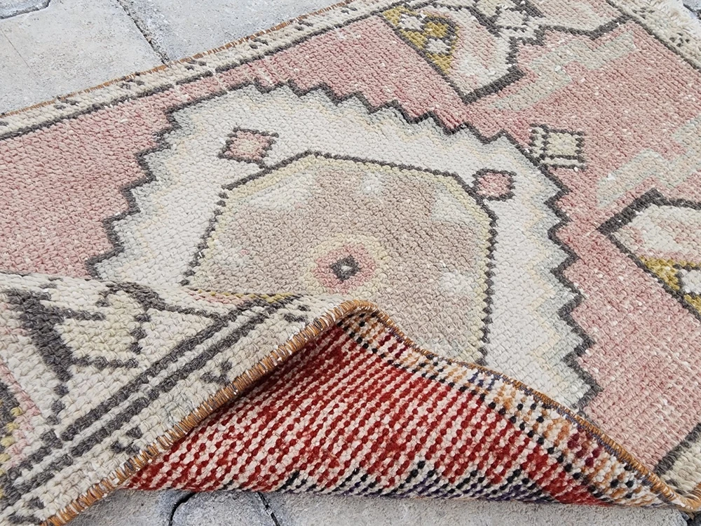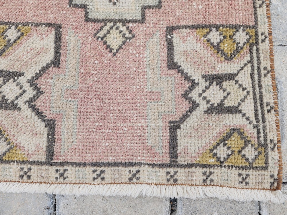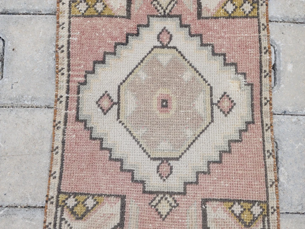 Turkish Vintage Rug – Powder Pink Octagon Medallion | Handwoven Boho Kilim This vintage Turkish kilim features a beautifully faded powder pink base, enriched with symbolic geometric motifs and a bold central medallion. Reflecting Oushak or Yörük weaving traditions, it combines cultural authenticity with minimalist elegance—perfect for boho, farmhouse, or rustic interiors. 🎨 Color Palette Main Color: Soft, powder blush pink Accent Colors: Cream, pale yellow, beige, taupe-gray, and black contour lines The faded finish gives this rug a serene, timeworn appearance that enhances its vintage charm. 🧵 Design Details At the center lies a large octagon-shaped medallion, surrounded by four small diamond motifs. The corners are decorated with triangle-based accents, highlighted by warm cream and yellow details. Its outer border is minimalistic, containing symbolic geometric forms that complement the rug’s delicate composition. 🧶 Craftsmanship & Style This handwoven Turkish rug showcases traditional techniques, most likely from the Oushak or Yörük design school. The subtle wash and soft palette make it a versatile decorative piece that blends beautifully with natural or vintage-inspired spaces. Product Features 📌 Origin : Turkey – Oushak / Yörük influence 📌 Material : Wool, plant-dyed 📌 Weaving : Handwoven vintage kilim 📌 Condition : Gently faded, original vintage condition 📌 Return Policy : 30-day return guarantee 📏 Dimensions ➡ Width: 46 cm ➡ Length: 85 cm 📦 Shipping & Delivery 🚀 Free shipping – Ships in 1–3 business days 🌍 Worldwide delivery – Carefully packaged for safe arrival 💬 Need additional details or close-up photos? Just send us a message!