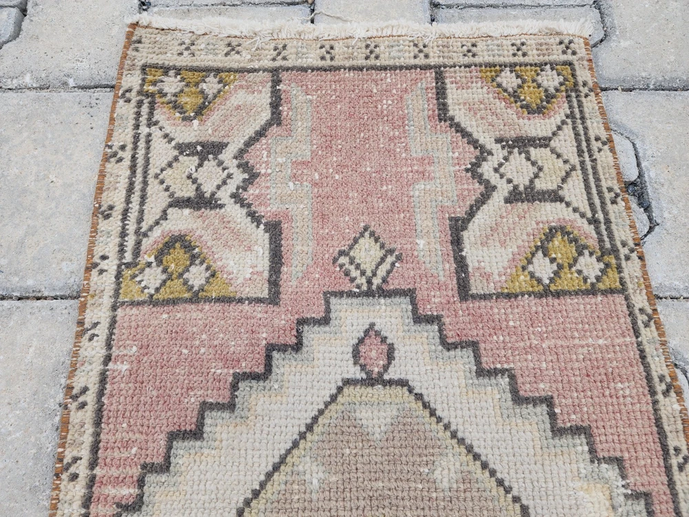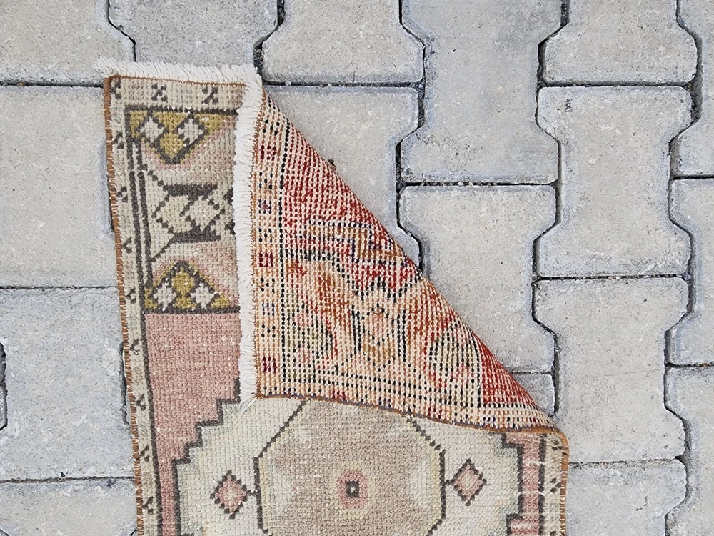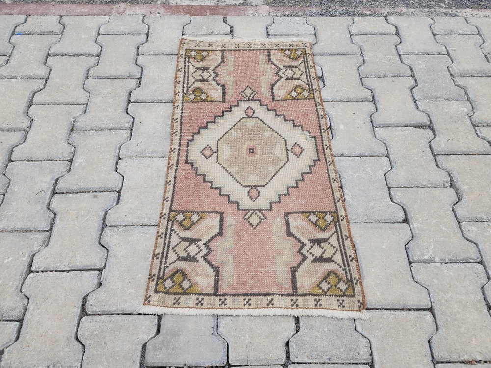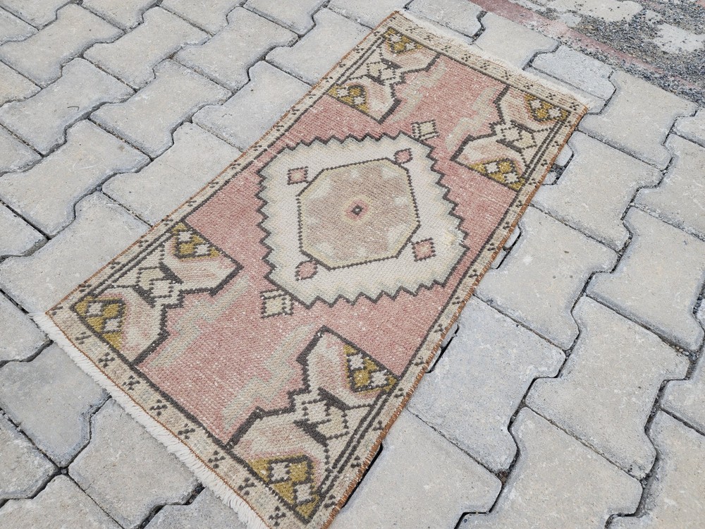 Turkish Vintage Rug – Powder Pink Octagon Medallion | Handwoven Boho Kilim This vintage Turkish kilim features a beautifully faded powder pink base, enriched with symbolic geometric motifs and a bold central medallion. Reflecting Oushak or Yörük weaving traditions, it combines cultural authenticity with minimalist elegance—perfect for boho, farmhouse, or rustic interiors. 🎨 Color Palette Main Color: Soft, powder blush pink Accent Colors: Cream, pale yellow, beige, taupe-gray, and black contour lines The faded finish gives this rug a serene, timeworn appearance that enhances its vintage charm. 🧵 Design Details At the center lies a large octagon-shaped medallion, surrounded by four small diamond motifs. The corners are decorated with triangle-based accents, highlighted by warm cream and yellow details. Its outer border is minimalistic, containing symbolic geometric forms that complement the rug’s delicate composition. 🧶 Craftsmanship & Style This handwoven Turkish rug showcases traditional techniques, most likely from the Oushak or Yörük design school. The subtle wash and soft palette make it a versatile decorative piece that blends beautifully with natural or vintage-inspired spaces. Product Features 📌 Origin : Turkey – Oushak / Yörük influence 📌 Material : Wool, plant-dyed 📌 Weaving : Handwoven vintage kilim 📌 Condition : Gently faded, original vintage condition 📌 Return Policy : 30-day return guarantee 📏 Dimensions ➡ Width: 46 cm ➡ Length: 85 cm 📦 Shipping & Delivery 🚀 Free shipping – Ships in 1–3 business days 🌍 Worldwide delivery – Carefully packaged for safe arrival 💬 Need additional details or close-up photos? Just send us a message!