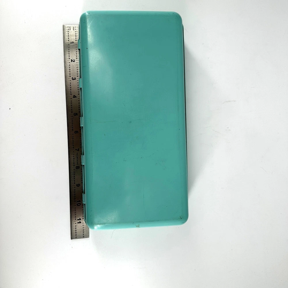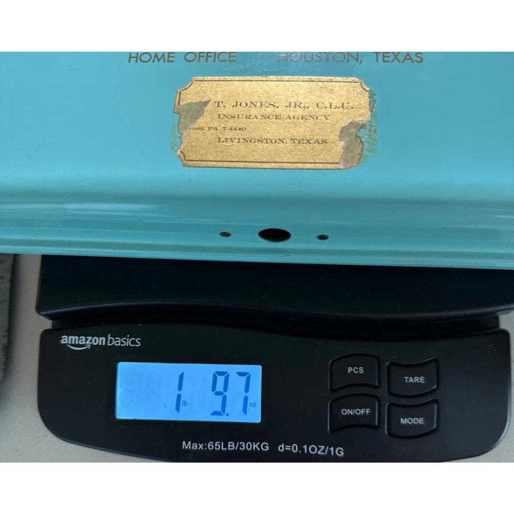Rare retro turquoise metal box with gold lettering from Great Southern Life Insurance Company, founded 1909 in Houston, Texas. Features hinged lid with secure clasp and original T. Jones Jr. C.L.U. Insurance Agency label from Livingston, Texas. Mid-century advertising collectible with bold color that makes it perfect for display, storage, or as a statement décor piece. Aesthetic turquoise finish gives this box a vintage look that fits retro office style, cottagecore storage, or shelf décor. Collectible and functional, ideal for those who love unique vintage finds with history. Approximate Measurements: Length 11", width 5.5", height 2". Weight 1 lb 9.7 oz. All measurements are approximate. Condition: Pre-owned vintage with surface scratches, small paint wear, and age marks that add to its authentic patina. Interior clean with original clasp intact intact but not closing and holding. Additional piece taped inside. Please review pictures for details.