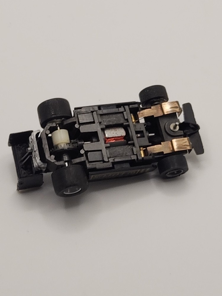 Tested with a 9 volt, motor runs great! Looks to be a different wing, but the previous collector took care of his cars, and this shows. Very cool example. Vintage Tyco #11 F1 Lotus HO slot car features a John Player black and gold livery, reflecting a classic design. Made by TYCO and designed as a car type in HO scale, this collectible piece is a nostalgic addition to any slot car collection.