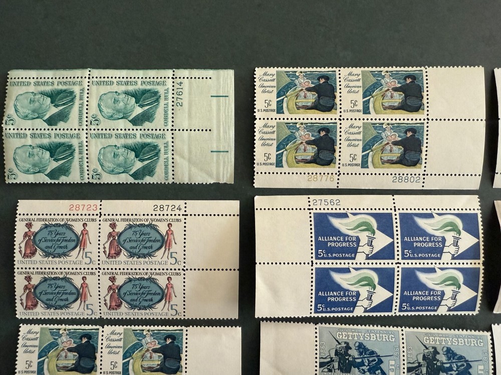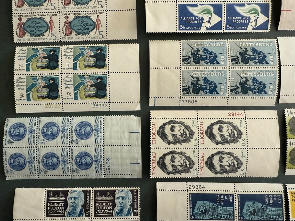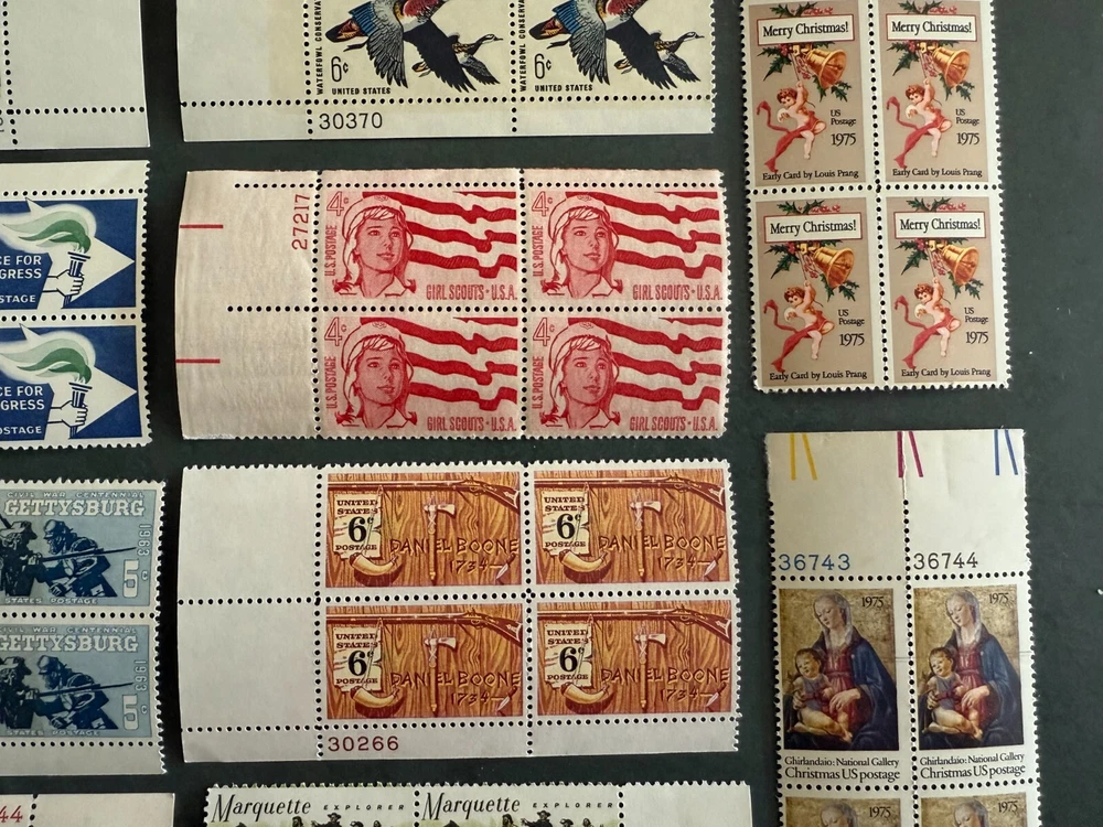 Random stamps all x 4 or 6: Ghirlandaio: National Gallery Christmas US Postage 1973 Daniel Boone - 6 cent National Park Service - 5 cent Marquette Explorer - 6 cent Girl Scouts USA - 4 cent Waterfowl Conservation - 6 cent Mary Cassatt American Artist - 5 cent Early Card by Louis Prang Merry Christmas postage 1975 Plan for better cities - 5 cent Thoreau - 5 cent Gettysburg - 5 cent Alliance for progress - 5 cent Cordell Hull - 5 cent Champion of Liberty - 4 cent Robert Fulton - 5 cent General Federation of Women's Clubs - 5 cent