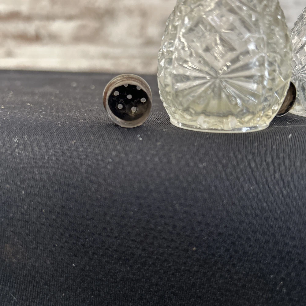 Elevate your dining experience with these petite crystal salt and pepper shakers, complete with stylish silver caps. A touch of Victorian elegance, they are crafted from clear glass, making them a subtle yet sophisticated addition to any table setting. Proudly made in the United States, these original shakers exude a timeless charm without the need for any modifications. Their age and the country of manufacture remain a mystery, adding an air of intrigue. Perfect for collectors and enthusiasts of decorative tableware, these shakers are a must-have for those who appreciate the finer details in life. Item sold as is Made in the USA Caps appear to be silver but have age on them. Shakers are 2 1/4 inches tall tall and about 1 3/4 inch wide. See photos for physical condition