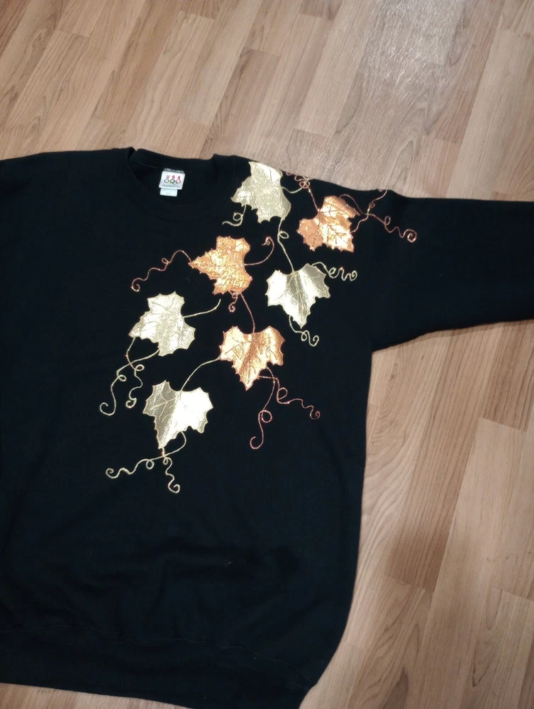 Show off your love for the USA with this vintage Olympic Apparel sweatshirt. The black sweatshirt features a stunning graphic print of 3D leaves, representing the Olympic spirit. The pullover sweatshirt has a crew neckline and long sleeves, perfect for all seasons. Made of a comfortable blend of polyester and cotton, this heavyweight sweatshirt is machine washable for easy care. The sweatshirt is lined and has the USA Olympic Apparel logo accents. Available in size XXL, this unisex sweatshirt is perfect for any USA Olympic fan.