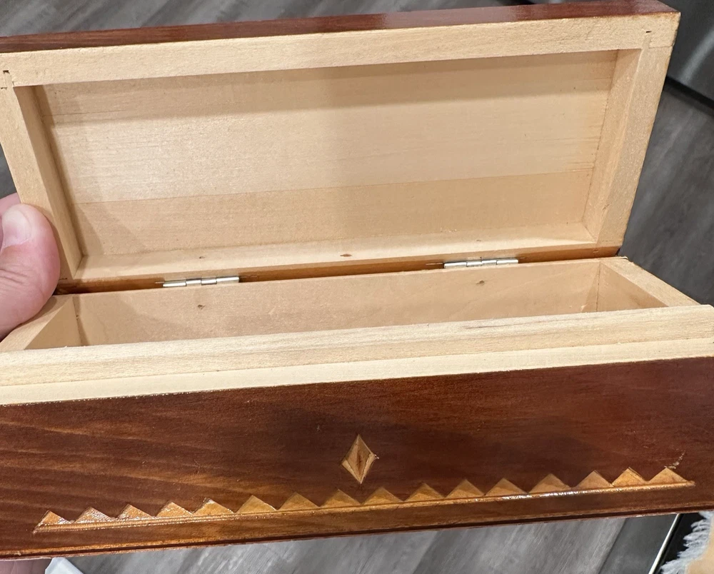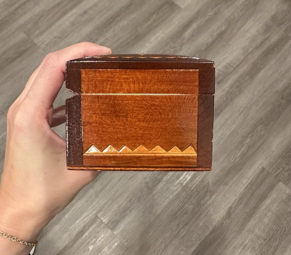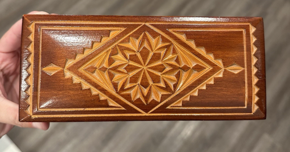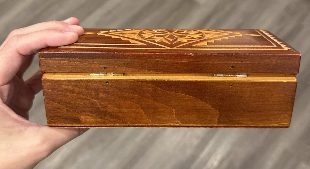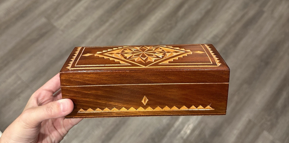 Vintage wooden hand-carved rectangular jewelry trinket keepsake box is a unique piece with a geometric pattern, making it suitable for all occasions. Measuring 7.5" in length and 3.25" in width and 2.5" in height, this small box features intricate carvings and a press fastening closure. Made in the USSR, signed. The Lacquered finish adds a smooth and polished look to the brown wood material, making it a charming addition to any collection of decorative collectibles. Beautiful piece! Measurements: 7.5"Lx3.25"Wx2.5"H This item will ship USPS Ground Advantage.