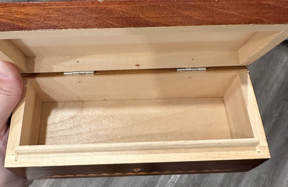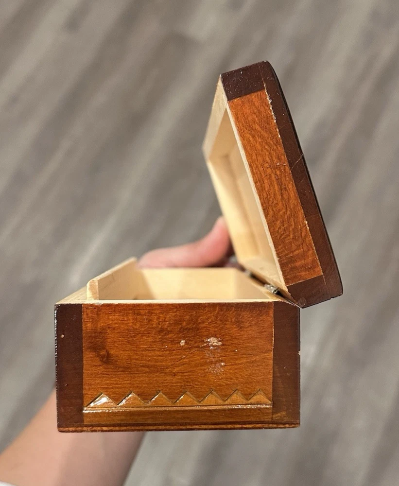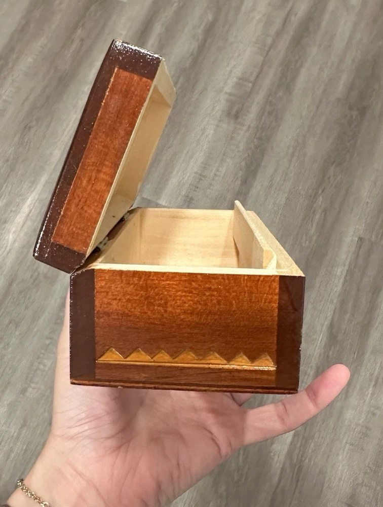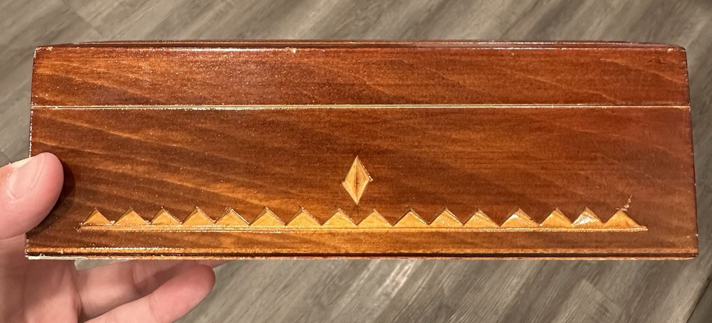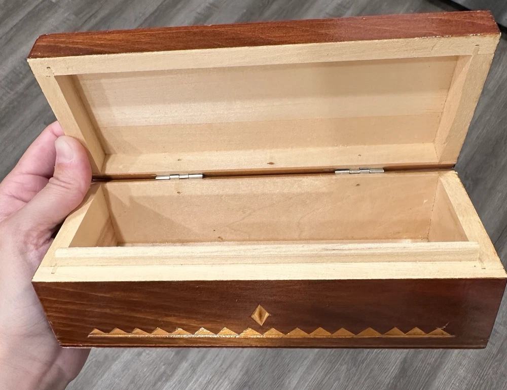 Vintage wooden hand-carved rectangular jewelry trinket keepsake box is a unique piece with a geometric pattern, making it suitable for all occasions. Measuring 7.5" in length and 3.25" in width and 2.5" in height, this small box features intricate carvings and a press fastening closure. Made in the USSR, signed. The Lacquered finish adds a smooth and polished look to the brown wood material, making it a charming addition to any collection of decorative collectibles. Beautiful piece! Measurements: 7.5"Lx3.25"Wx2.5"H This item will ship USPS Ground Advantage.