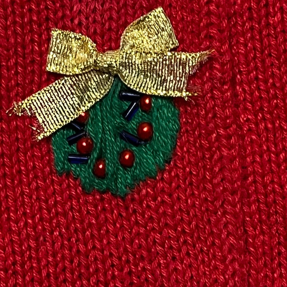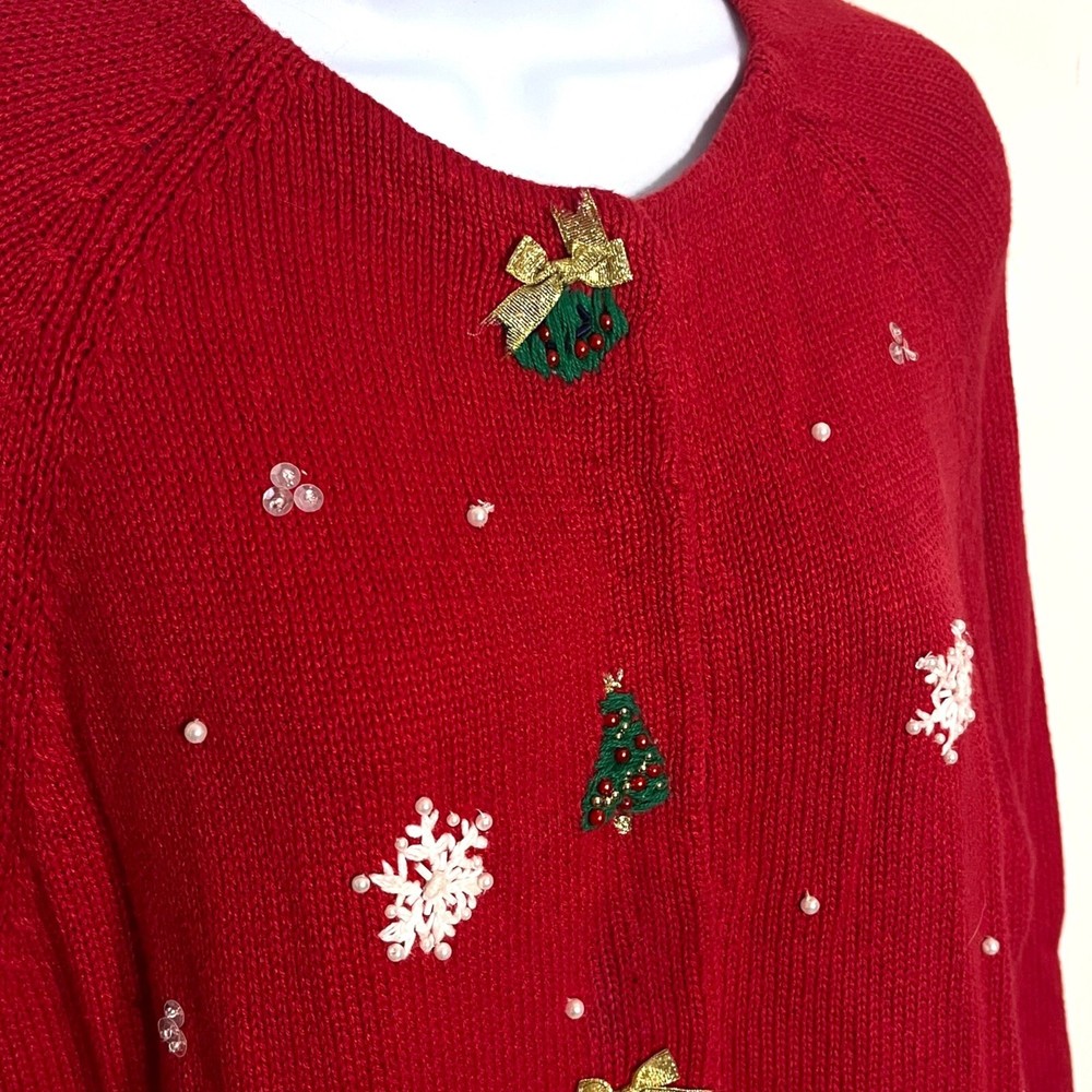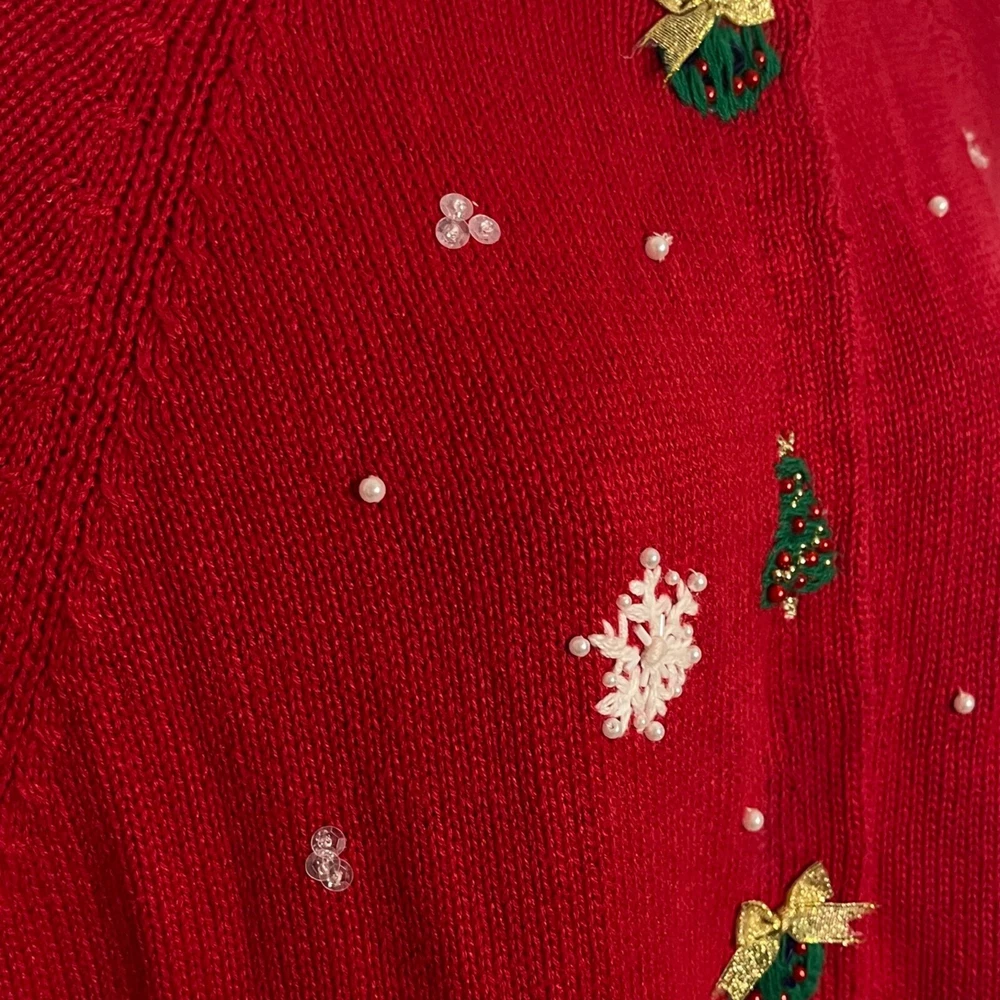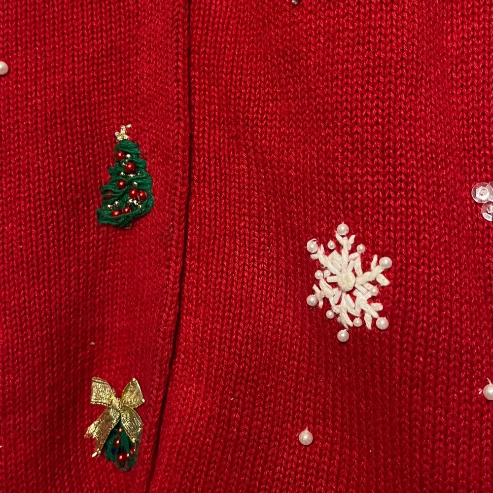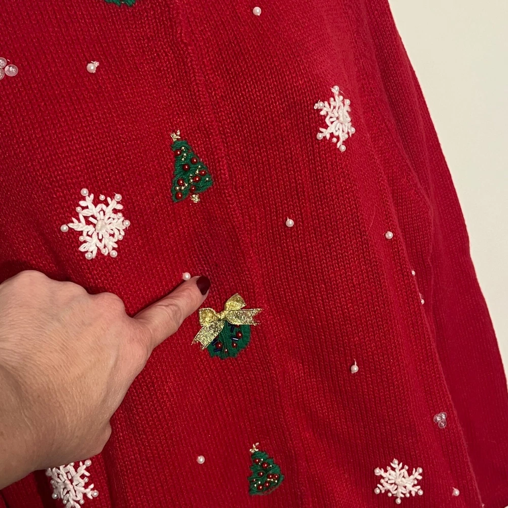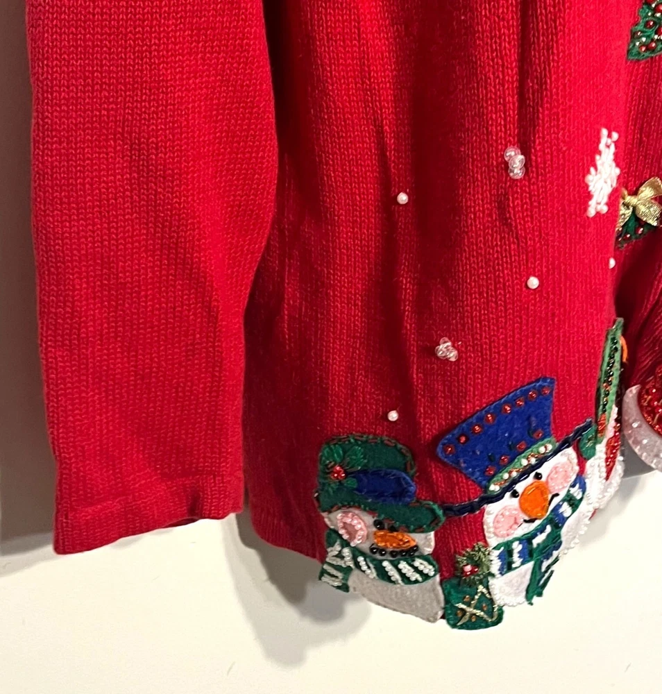 Ramie/Cotton Vintage 2002 Y2K Hidden front buttons Red with embroidered snowflakes, snowmen, Chriastmas trees Good vintage condition. Very faint area of discoloration on front. Hard to see unless you're looking for it. See last photo. Ugly Christmas sweater, grandma, vintage, ornate, unique, eye-catching, colorful , bows, cottagecore, embellished, Across the chest (armpit to armpit) 21 Length 26