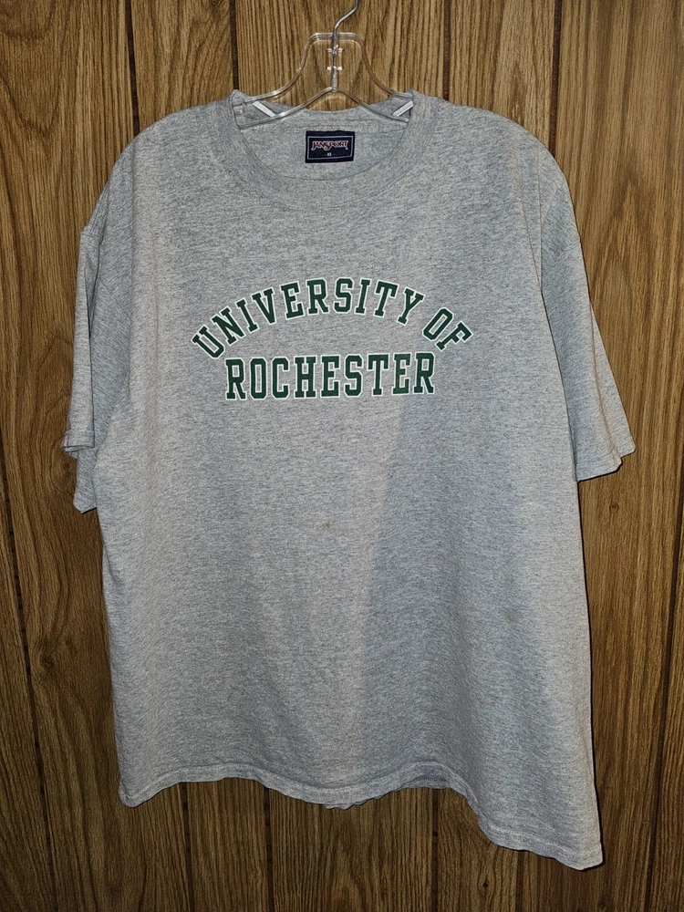 Small discoloration spots see pictures for details Show your love for the University of Rochester with this vintage men's T-shirt. The shirt features the iconic Yellow Jackets football team logo and is officially licensed by the NCAA. This pre-owned shirt is a size XL and is perfect for regular season games and beyond. The color is a classic gray, making it a versatile addition to any fan's wardrobe. The brand is Jansport and the country/region of manufacture is unknown. This shirt is a must-have for any true fan of the Rochester Yellow Jackets.