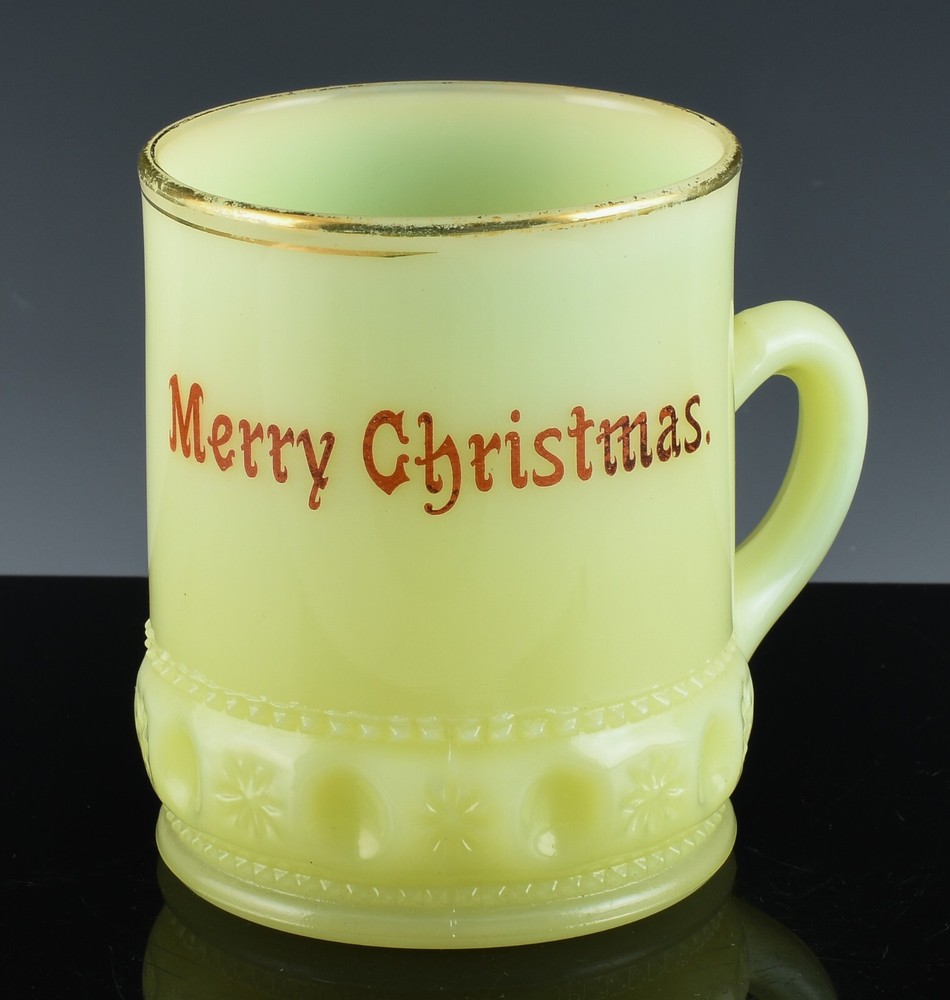 Note To all Buyers. Shipping is usually done within 1 Full Business Day Of Payment. All shipping is provided a tracking number, and regardless of location arrives usually between 2-7 Business days, please ignore the estimated time Ebay displays for you. DESCRIPTION : Here we are offering Uranium glass mug, up for sale and your consideration. Made from fine Vaseline glass containing traces of Uranium, which makes the piece admit a bright Zombie green like glow when under the effects of a UV Black Light. This piece is in the very collectible custard glass and has such a strong glow. The merry Christmas is in a fine gold and the embossed base is eye catching. Very cool, perfect for a nice Collection or would make the most outstanding gift to someone dear to you! The last photo is a small sample of the Uranium glass we have to offer, please check out our Page, and save greatly with combined shipping! CONDITION : In Vintage Estate Fresh condition, with no chips, cracks, or repairs. Only some minor scuffs and wear consistent with age. MEASUREMENTS : The Mug measures approx. 3-1/4 inches tall by 2-1/2 inches wide across the top. SHIPPING : We offer combined shipping on orders, therefor the more you order the cheaper the shipping!! We also offer Worldwide Shipping on the vast majority of our stock, please contact us to arrange your worldwide and specific shipping needs!
