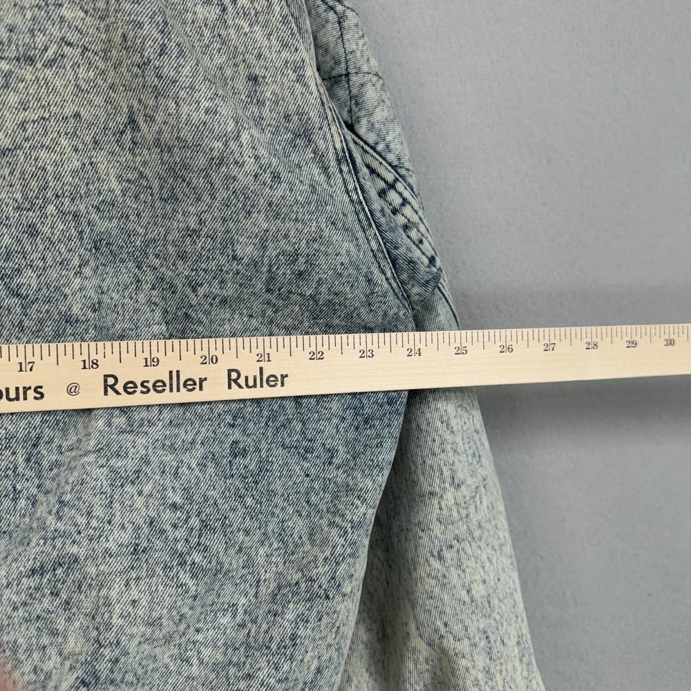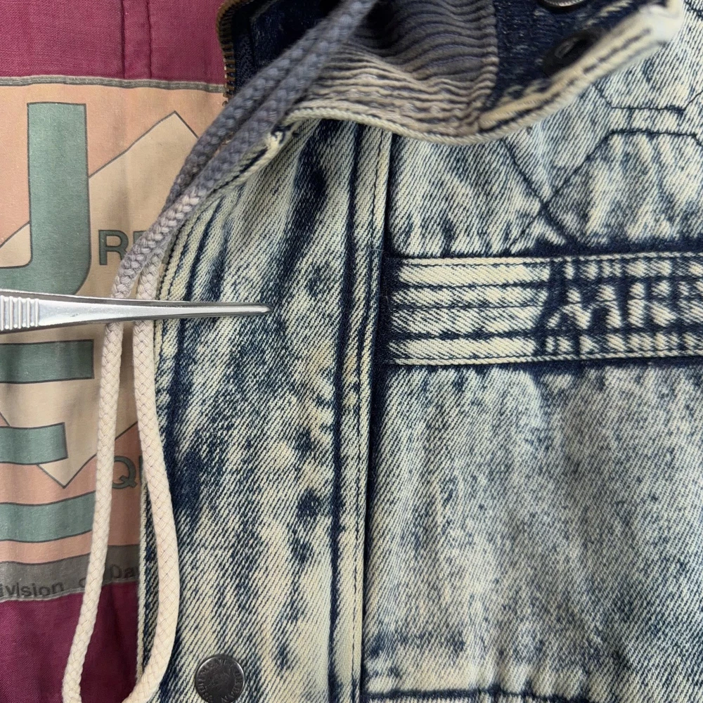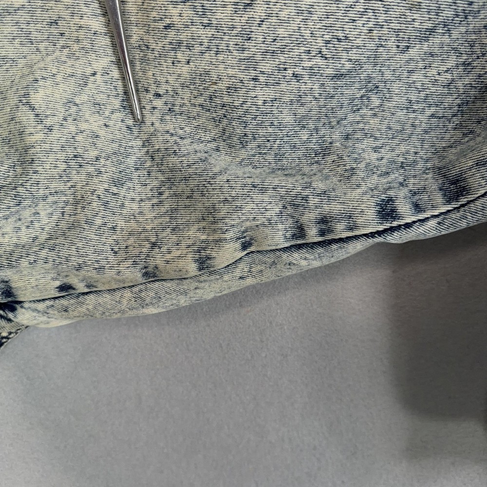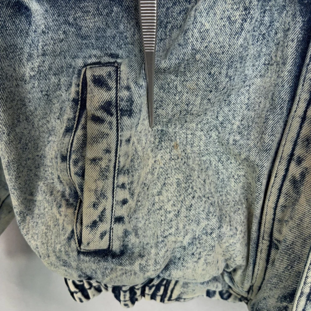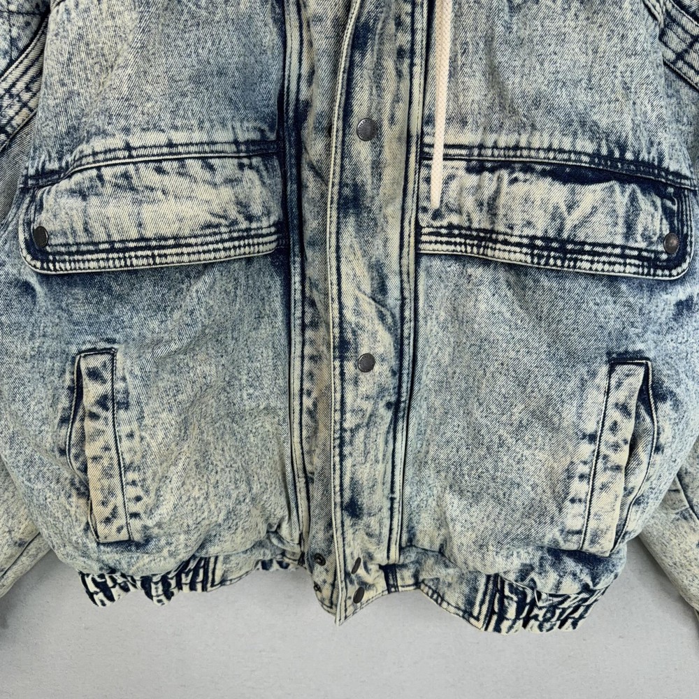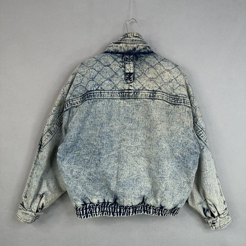 Vintage Urban Equipment Jacket Mens Large Blue Denim Bomber Quilted Elastic 80s Discoloration around collar. Pre-owned vintage Urban Equipment denim bomber jacket with light to moderate overall wear from prior use. Fabric and lining are structurally sound with intact stitching, zipper, snaps, drawcords, and elastic waistband. Multiple small tan discoloration spots are present on the front placket, lower front, pockets, shoulders, sleeve near the cuff, and upper back as shown in photos. Interior size label is missing; size is set to Mens Large. Brand: Urban Equipment. Style: Vintage mens acid wash denim bomber jacket. Color: Light blue stonewash denim with darker navy blue marbling and trim. Size: Mens large. Material: Cotton denim outer shell. Fabric type: Midweight denim with quilted upper body and textured acid wash finish. Details: Tall stand-up collar with inner rib-knit insert and drawcord, full front zipper with snap storm flap, and elasticized waistband. Features: Two front chest flap pockets with snaps, two lower slant hand pockets, adjustable snap cuffs, quilted shoulders and back yoke, and fully lined interior. Branding and logos: Large UE Urban Equipment label on interior lining with geometric graphic design and Urban Equipment wording, noting Division of David Peyser Inc. Lining: Smooth quilted interior in a deep burgundy tone for added warmth and comfort. Intended use: Designed for casual wear, streetwear looks, and layering in cool weather. Special notes: Oversized relaxed fit and bold acid wash treatment capture classic late 1980s denim outerwear style. 25514 Measurements: Previous washings may change sizing on the tag. Refer to photos above for all measurements. Compare our measurements to one of your favorite garments. Measurements are approximate. All items are bagged and sealed after being photographed, then stored in a smoke free environment. Washed per eBay standards. I carefully package and ship daily. Contact me with any questions. Thanks