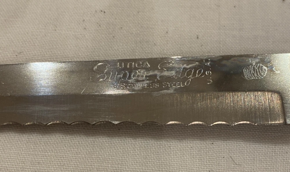 Vintage Utica Super Edge Knife Set Set of 6 Serrated Steak Knives In Wooden Holder Blade Length - 5" Very Good Vintage Condition. See all photos. Non-smoking home. Be sure to check out my other items ! I am happy to combine shipping charges. Please note: My goal is always 100% complete customer satisfaction. If for any reason you feel your item arrives "not as described," please contact me before leaving feedback. I am a trading assistant. I can sell items for you! |KES-SIS|