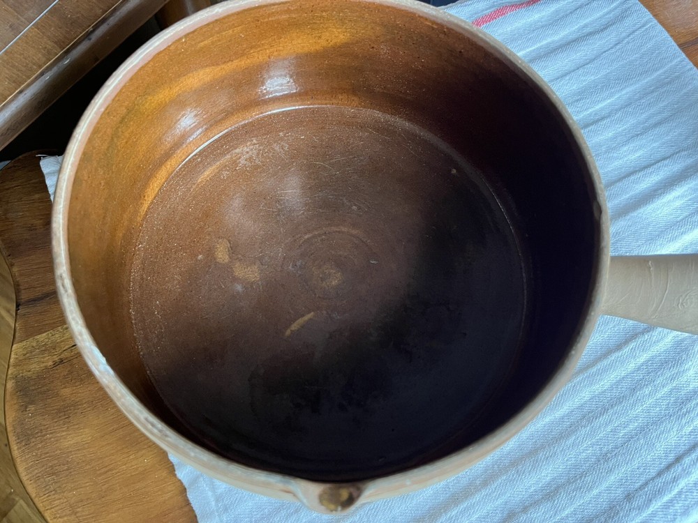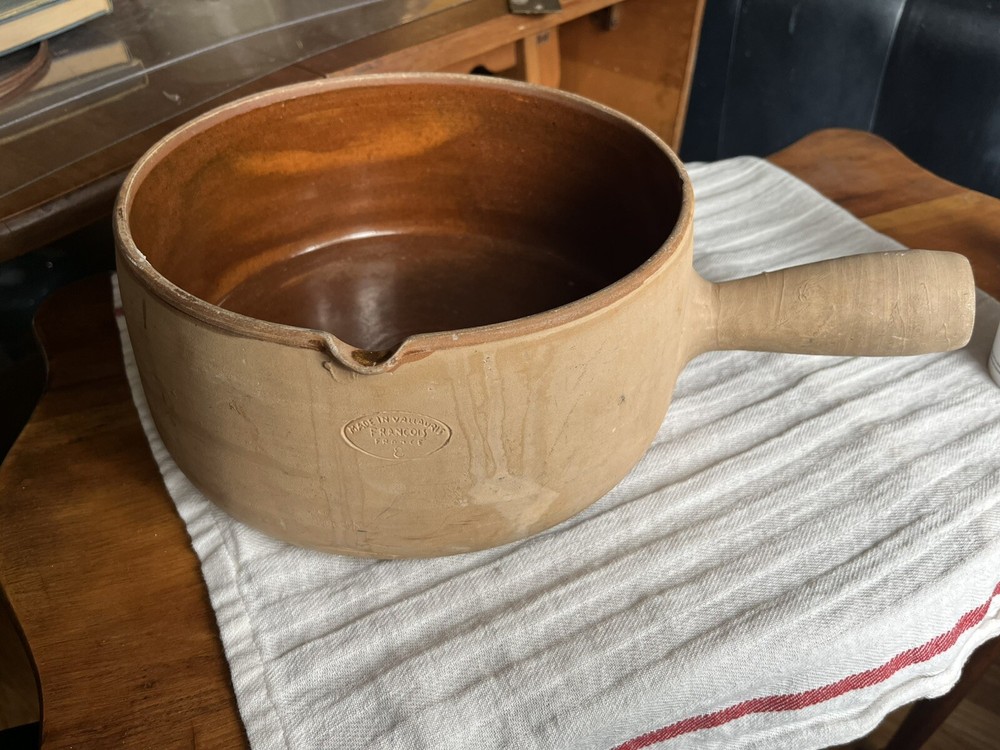 Add a touch of vintage charm to your kitchen with this beautiful Vallauris casserole pan. Made in France from high-quality terracotta, this round pot features a vibrant orange color and a ceramic surface coating that makes it suitable for gas and induction stoves. The pot comes with a handle for easy handling. Perfect for slow cooking and serving, this original Vallauris pot is a collectible item that will add character to any kitchen. Please see photos as part of description. Signs of age and use.