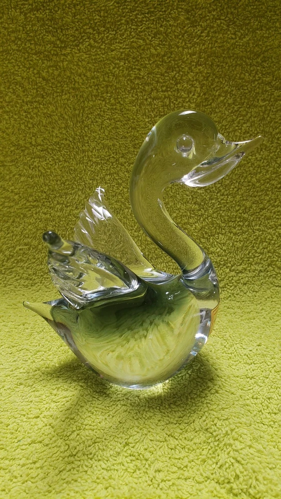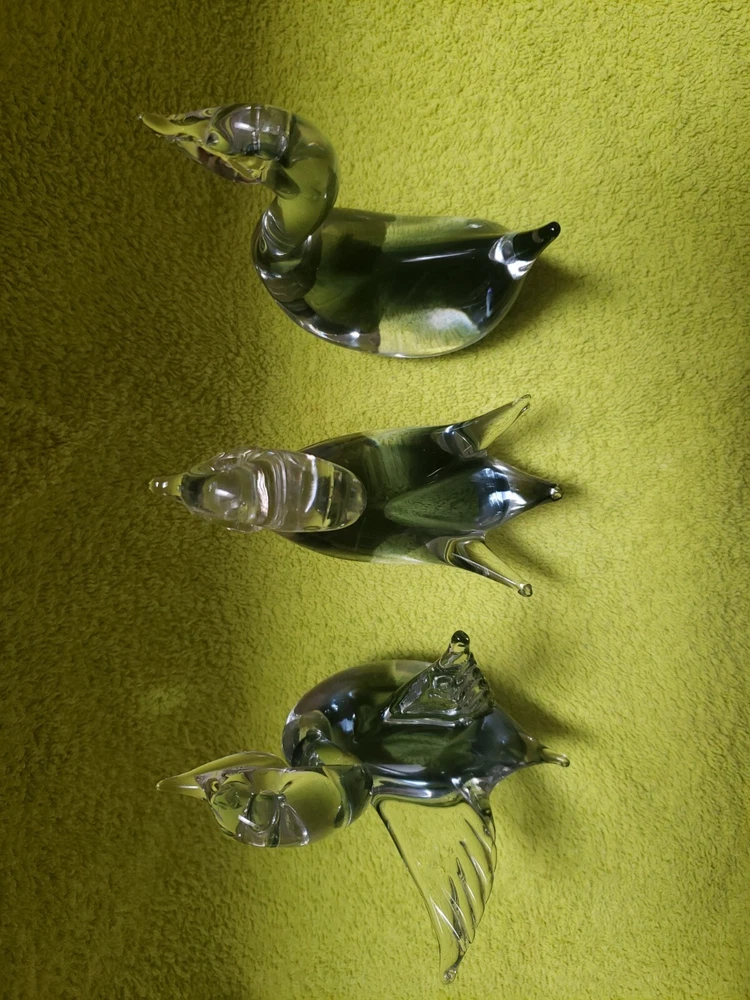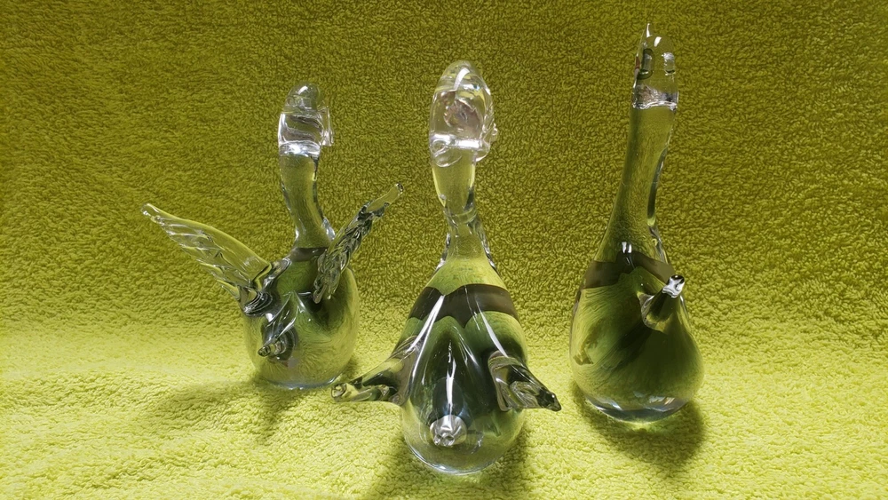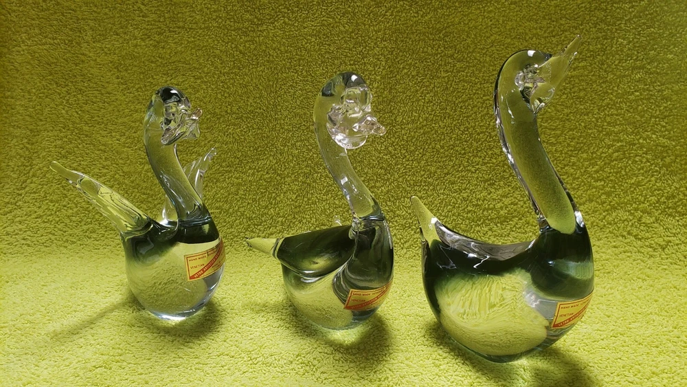 Add some Venetian charm to your collection with this beautiful set of three glass swans. Crafted in Murano, Italy, these figurines showcase exquisite detail and a delicate beauty that is sure to capture your heart. Handmade with care, each swan is a unique work of art that will make a stunning addition to any home. Whether you're a collector of fine glassware or simply appreciate the beauty of these majestic birds, this set is a must-have for your collection. So why wait? Add a touch of Italian elegance to your home today with this exquisite set of glass swans! The tallest swan is the one with the wings fully tucked and stands 6" tall, then the one unfurling is 5.50" tall, and the one with the wings fully extended is 5" tall. The swans have zero chips or cracks. Check out the photos and message me with any questions you may have. While these beautifully crafted swans are on the small size they pack an unexpected heft/weight. Don't let this unexpected set pass you by. Individually the same swans are selling for $35 each.
