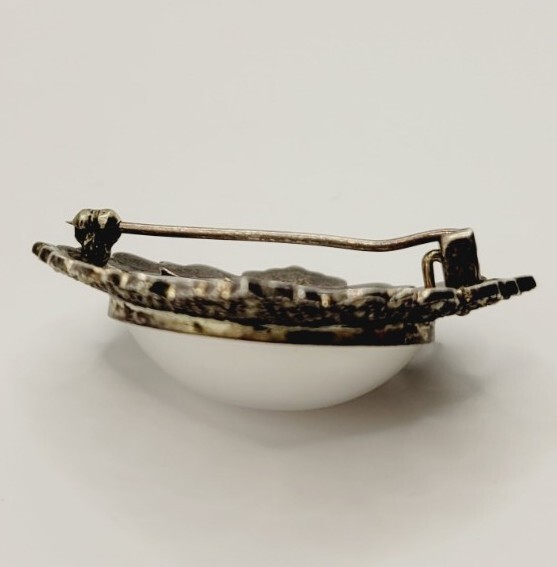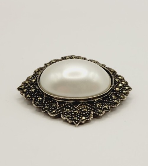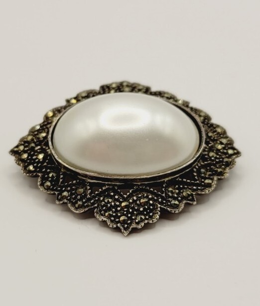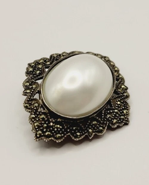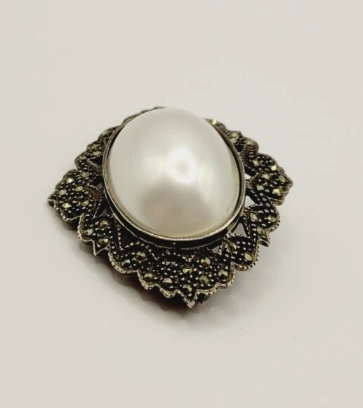Type:BroochColor:WhiteVintage:YesMetal:Sterling SilverJewelry Department:FineMain Stone Shape:CabochonMain Stone:Faux PearlMetal Purity:925 parts per 1000Department:WomenMaterial:Faux PearlSecondary Stone:MarcasiteItem Length:1.5 inBrand:Unbranded