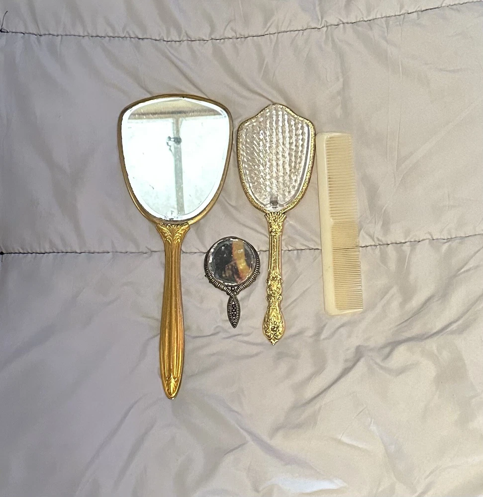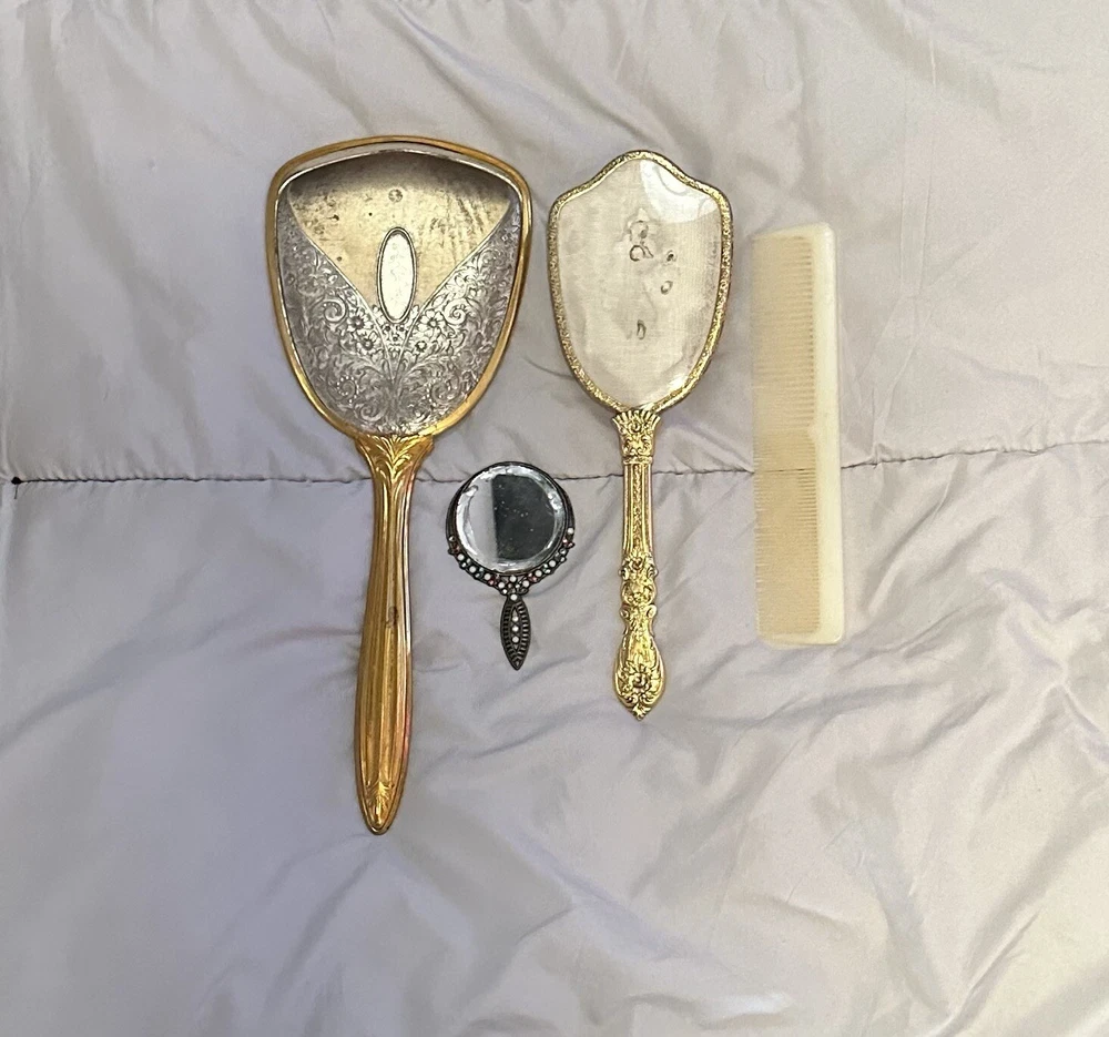 The vintage Victorian hand held metal vanity mirrors, comb and brush are a set of four units. The large mirror is 13 in long, the small mirror is 4 in long, the comb is 7.75 in long and the brush is 10.25 in long. These mirrors are designed for personal grooming and beauty routines, featuring a classic and elegant Victorian style. The metal material adds durability and a touch of vintage charm to the set. Perfect for collectors or those looking to add a unique piece to their vanity or dressing area, these mirrors offer a glimpse into the past with their intricate design and craftsmanship.