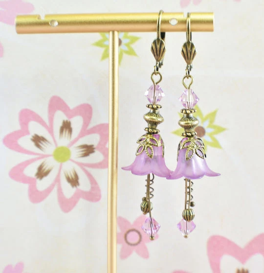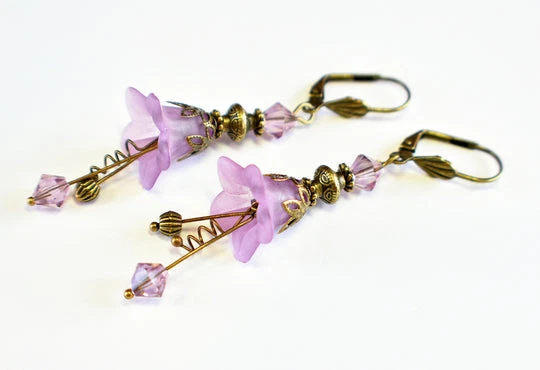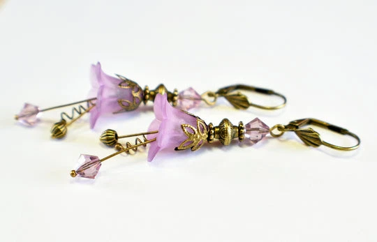 These vintage look flower earrings are so pretty and delicate; really striking. The bold 6mm bicone crystal accents on top and bottom really make them sparkle! This classic look makes these a great bridal party gift or accessory, or a wonderful gift for any occasion. Or just for you ... Available in 20 colors. 2 inches long Lever back antique bronze ear wires Lead free/nickel free Available Colors: Emerald Green Siam Red Pale Pink Navy Blue Light Blue Royal Blue Denim Blue Aqua Blue Dark Prussian Blue Teal Chocolate Brown Peach Peridot Green Purple Lilac Fuchsia Violet Yellow Black White