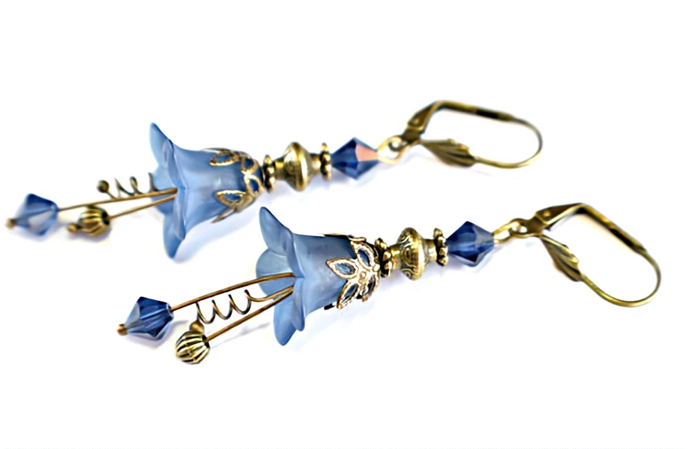 These vintage look flower earrings are so pretty and delicate; really striking. The bold 6mm bicone crystal accents on top and bottom really make them sparkle! This classic look makes these a great bridal party gift or accessory, or a wonderful gift for any occasion. Or just for you ... Available in 20 colors. 2 inches long Lever back antique bronze ear wires Lead free/nickel free Available Colors: Emerald Green Siam Red Pale Pink Navy Blue Light Blue Royal Blue Denim Blue Aqua Blue Dark Prussian Blue Teal Chocolate Brown Peach Peridot Green Purple Lilac Fuchsia Violet Yellow Black White
