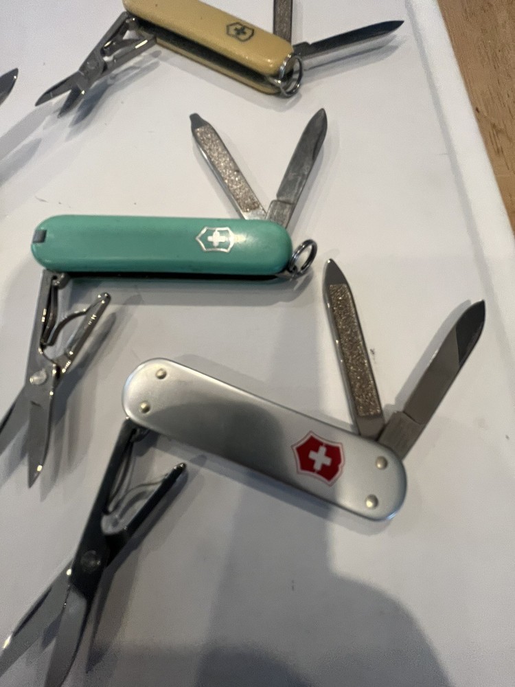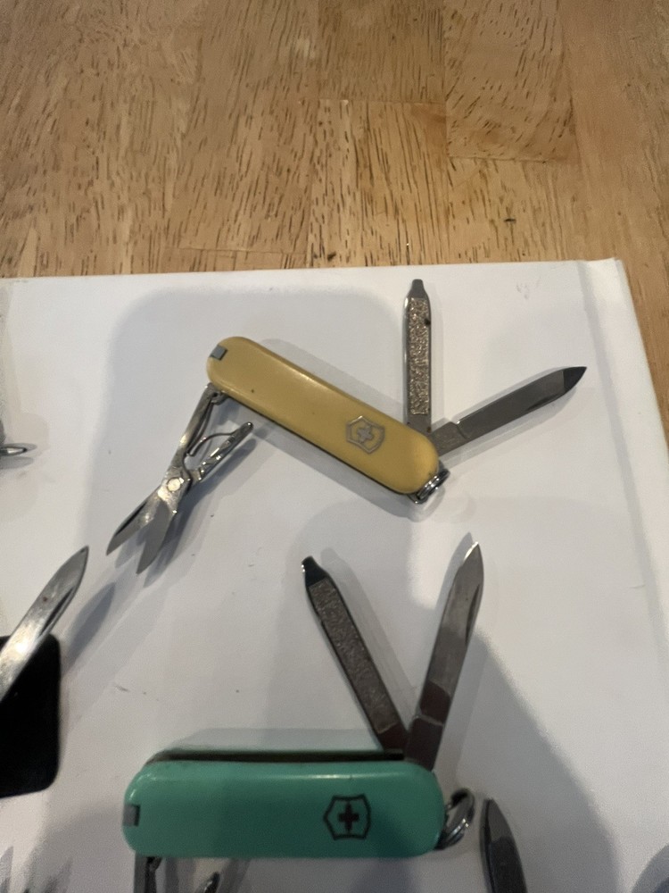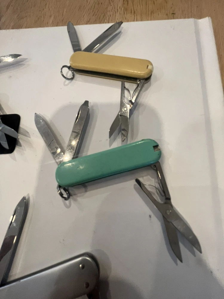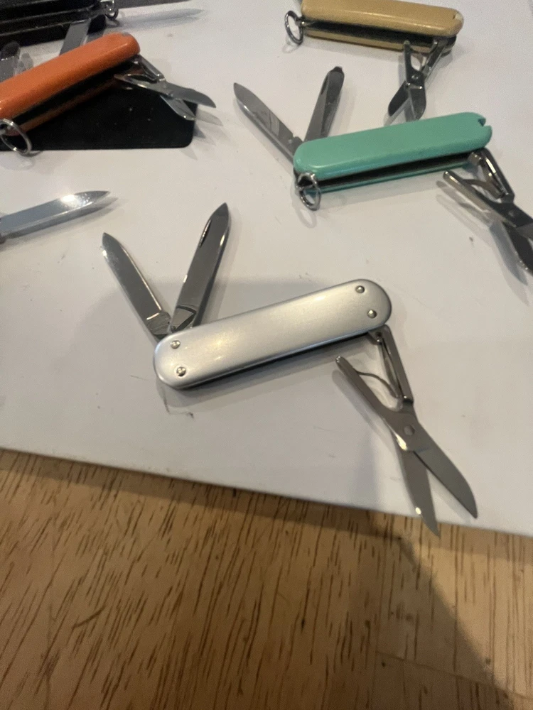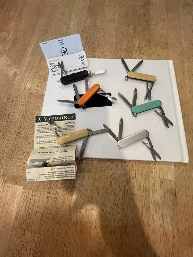 Offering six mini victorinox swiss army knifes. The teal colored one is missing pic. Please view pictures sold as is.