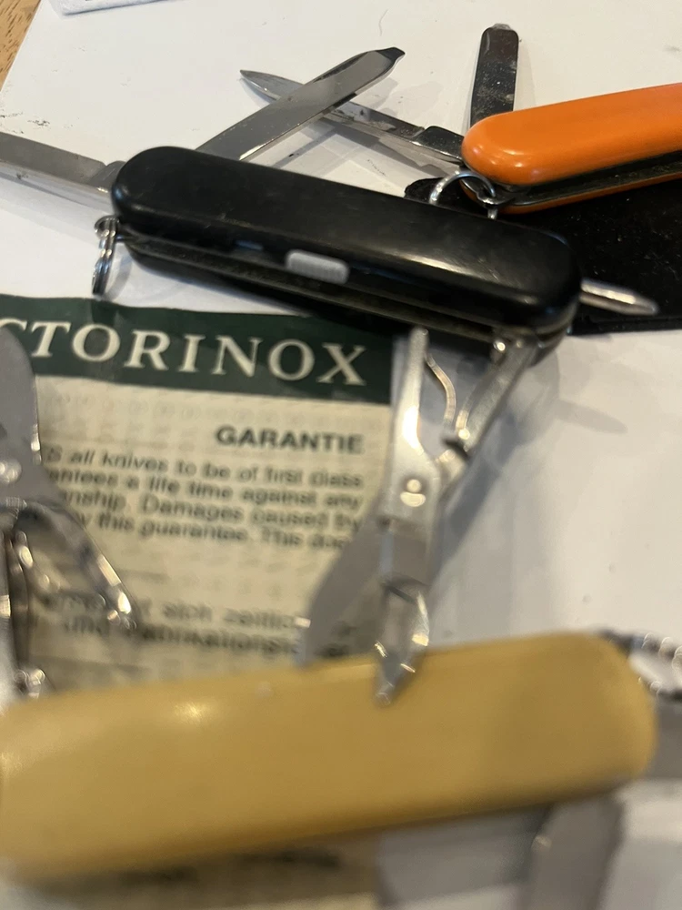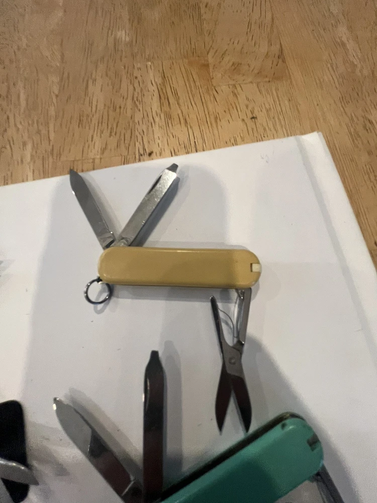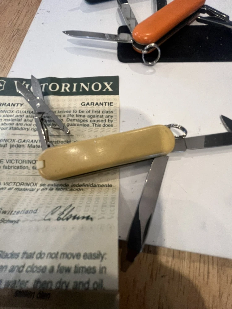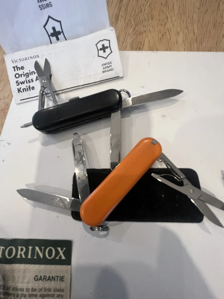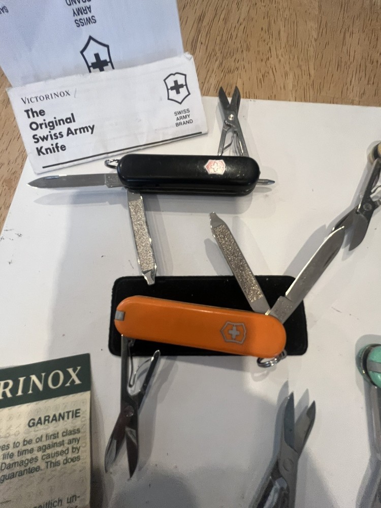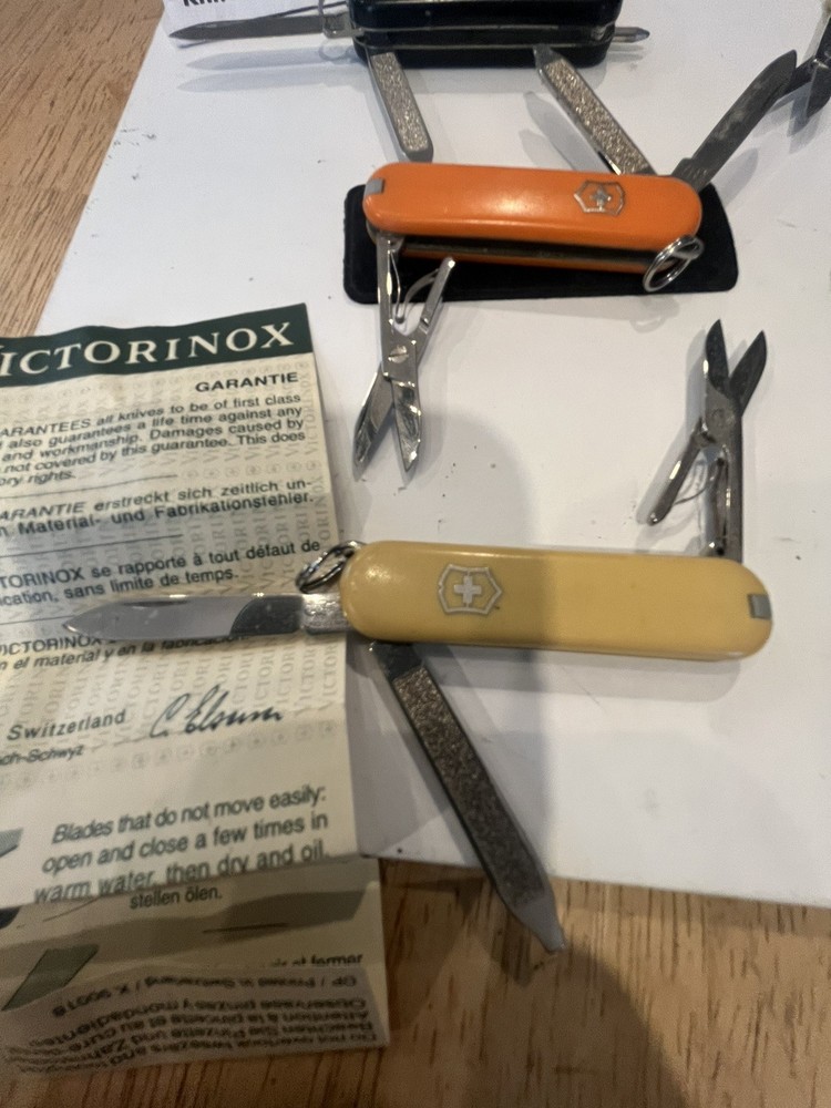 Offering six mini victorinox swiss army knifes. The teal colored one is missing pic. Please view pictures sold as is.