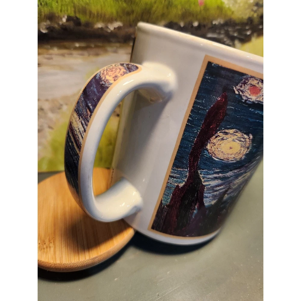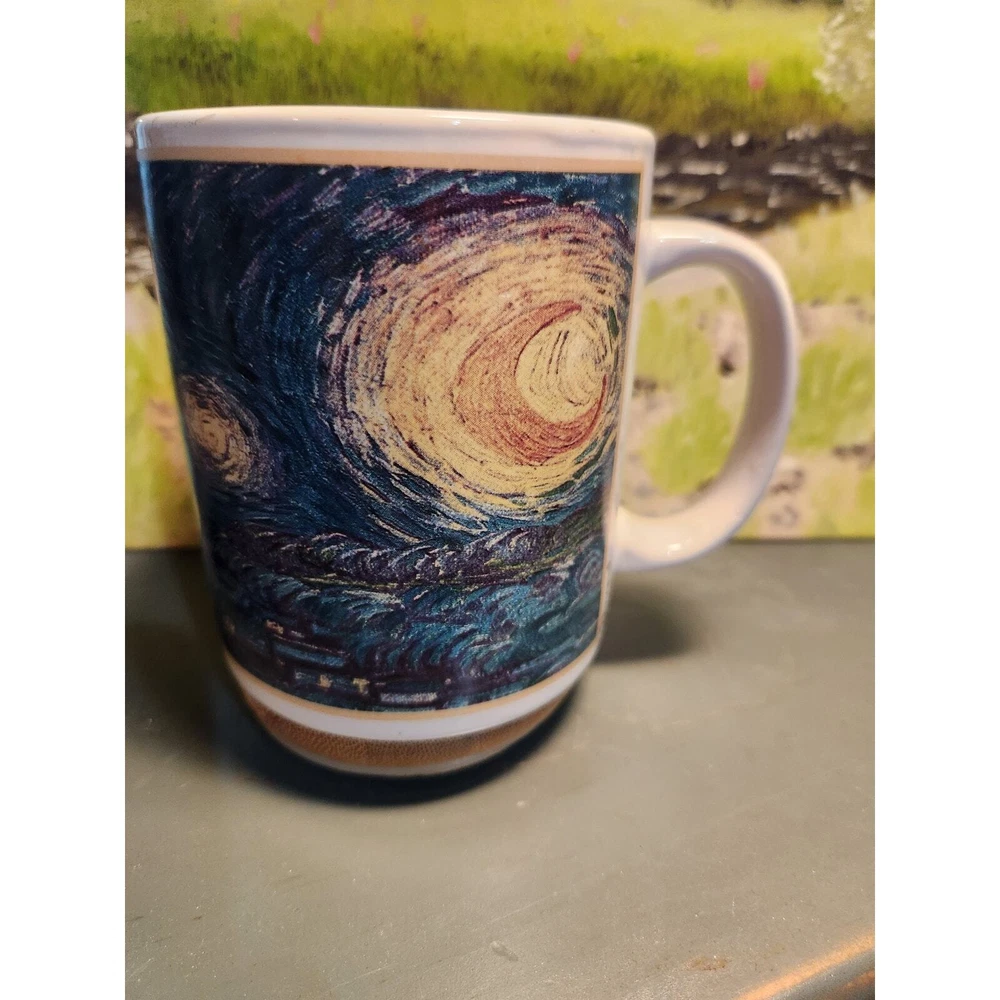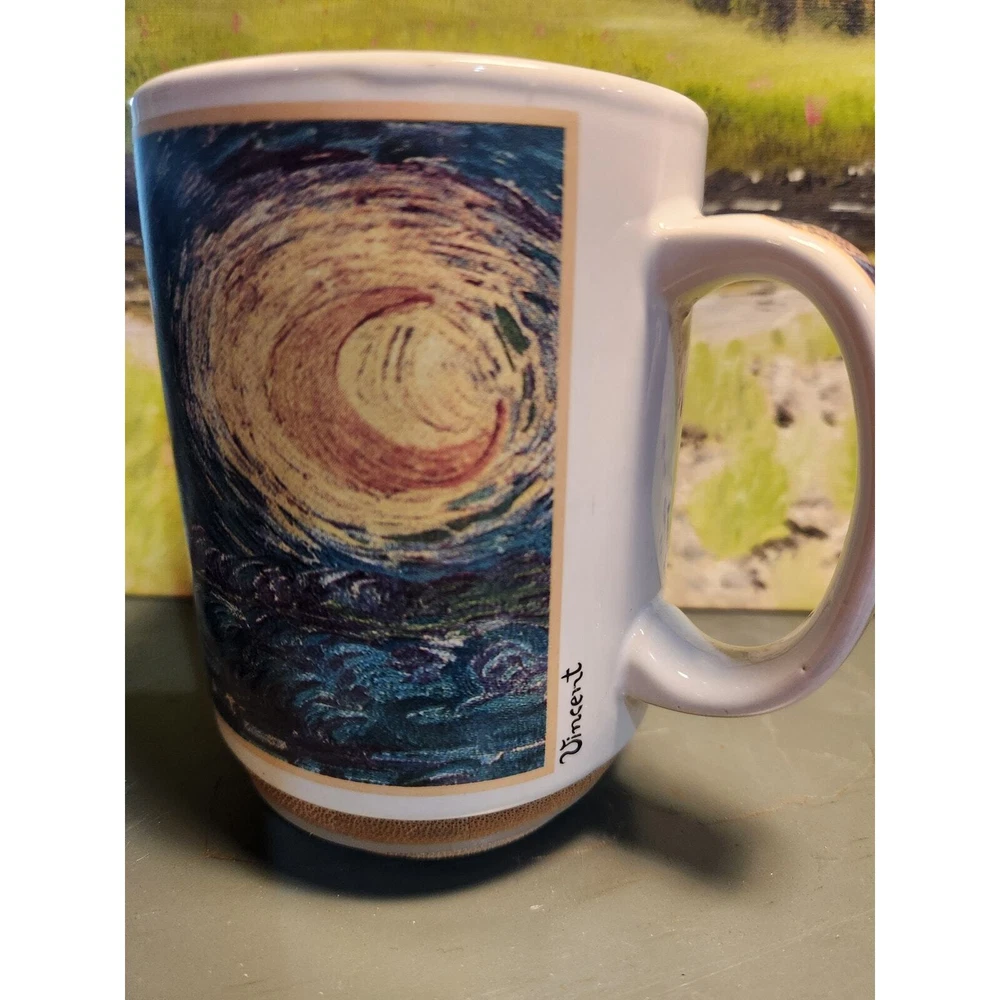 What a beautiful way to share & enjoy the art of the famous Van Gogh's Starry Night. This mug has a screen print of the painting across the main body of the mug, but it also includes a printed handle, a nice touch to the mug! Create by Art Cafe this mug will be a beautiful piece of art with your morning coffee! It makes a great gift for the art lover in your life. 14 oz capacity, 3.5" diameter. Suitable for both hot & gold beverages. Great condition with no major flaws (chips or cracks in the mug). Normal signs of wear from use may be present.
