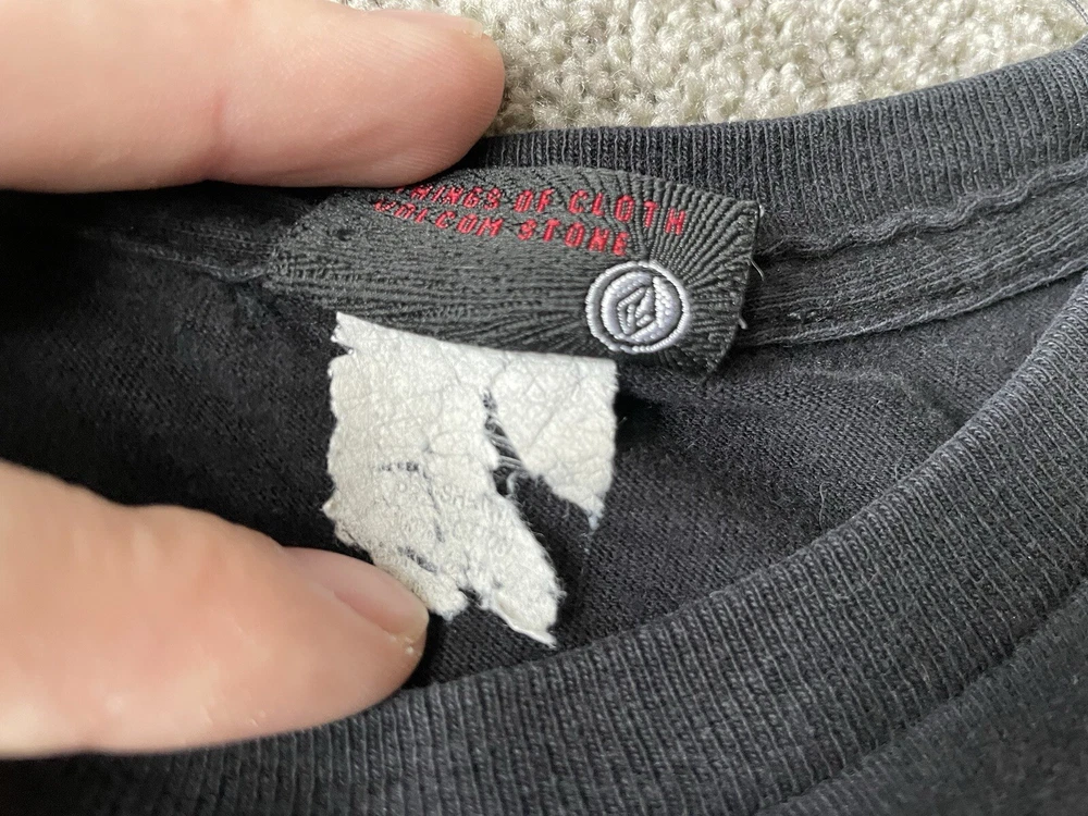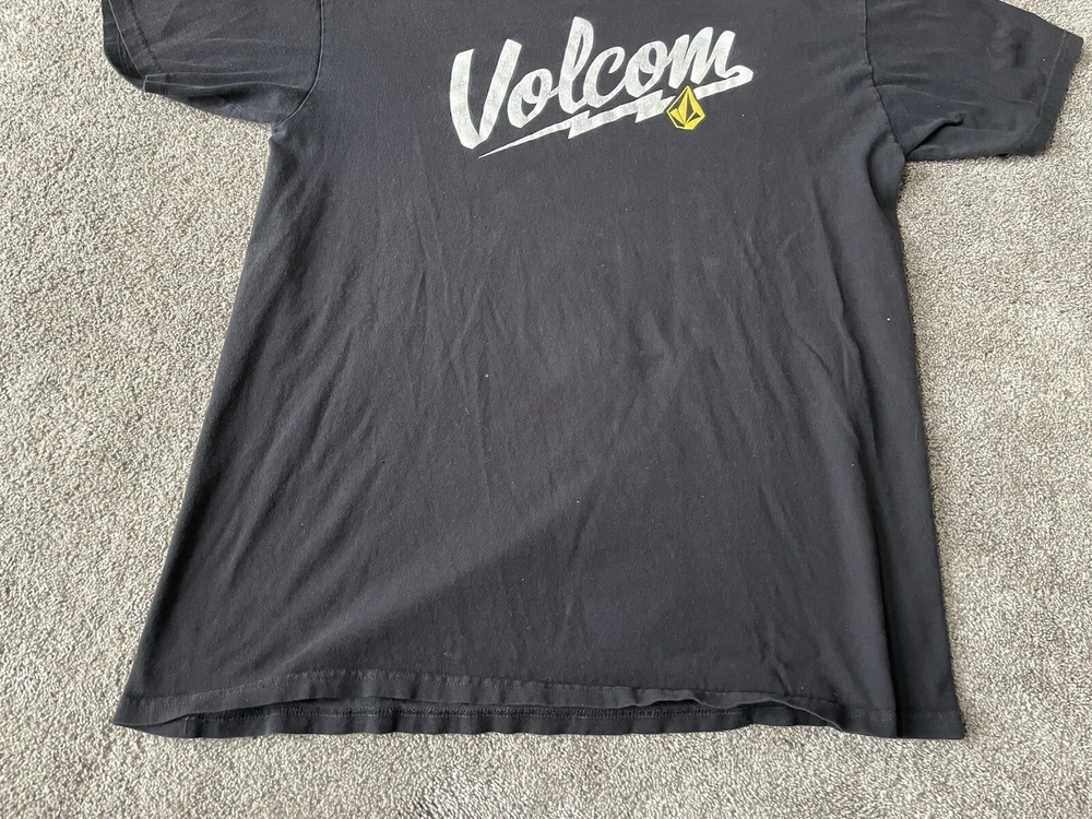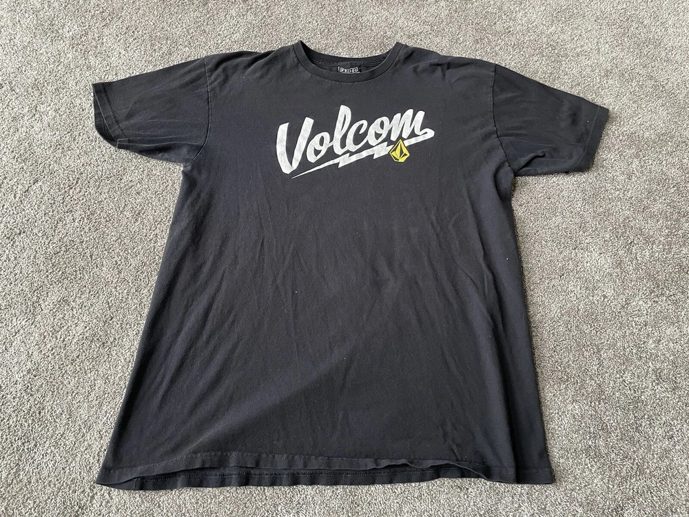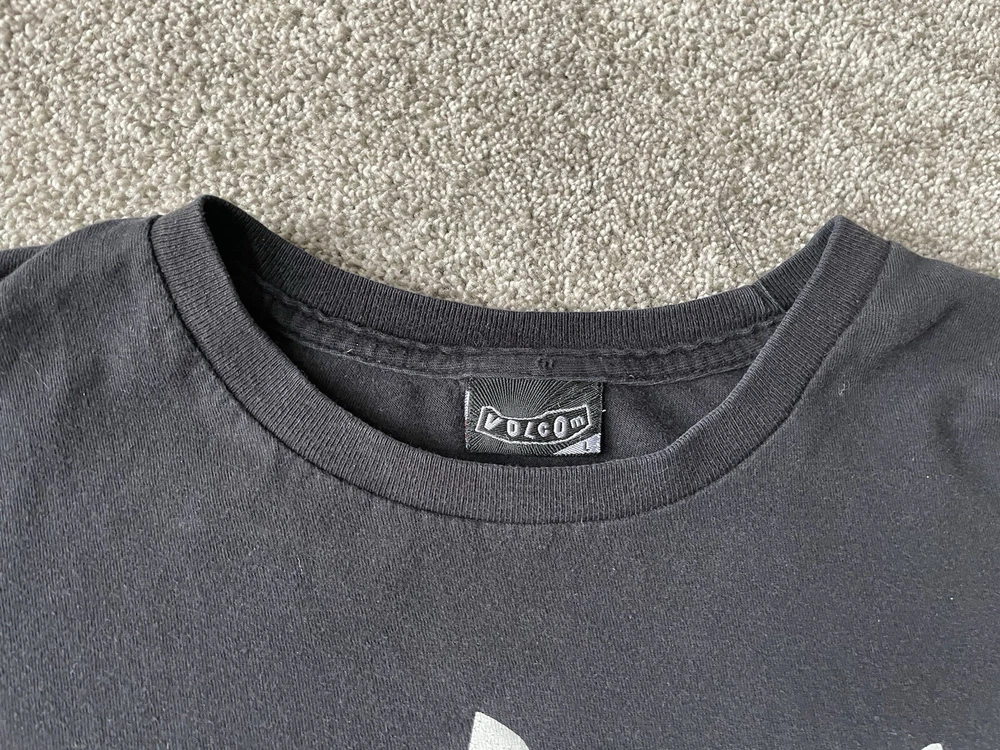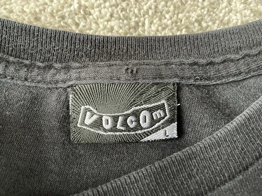 This is a vintage Volcom T-shirt for men, size large, in black with a graphic print. It has short sleeves and a crew neck, made of cotton with a knit fabric type. The shirt features a classic and retro theme with accents of the Volcom logo. It is machine washable and easy to care for, preshrunk, collarless, and suitable for all seasons. The shirt is vintage and was manufactured in the 2000s, perfect for skaters and those who love grunge and punk styles.
