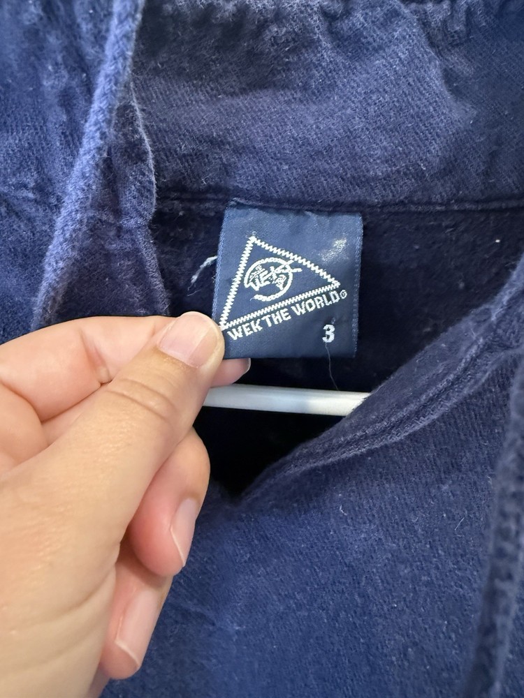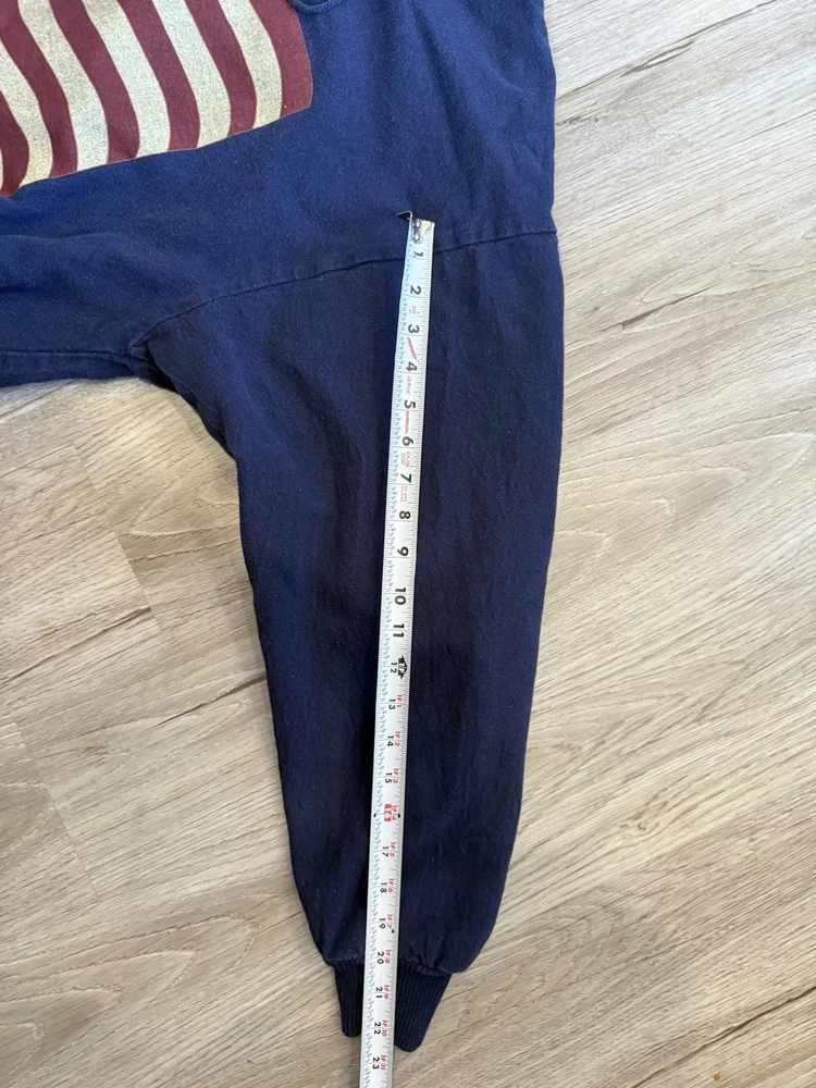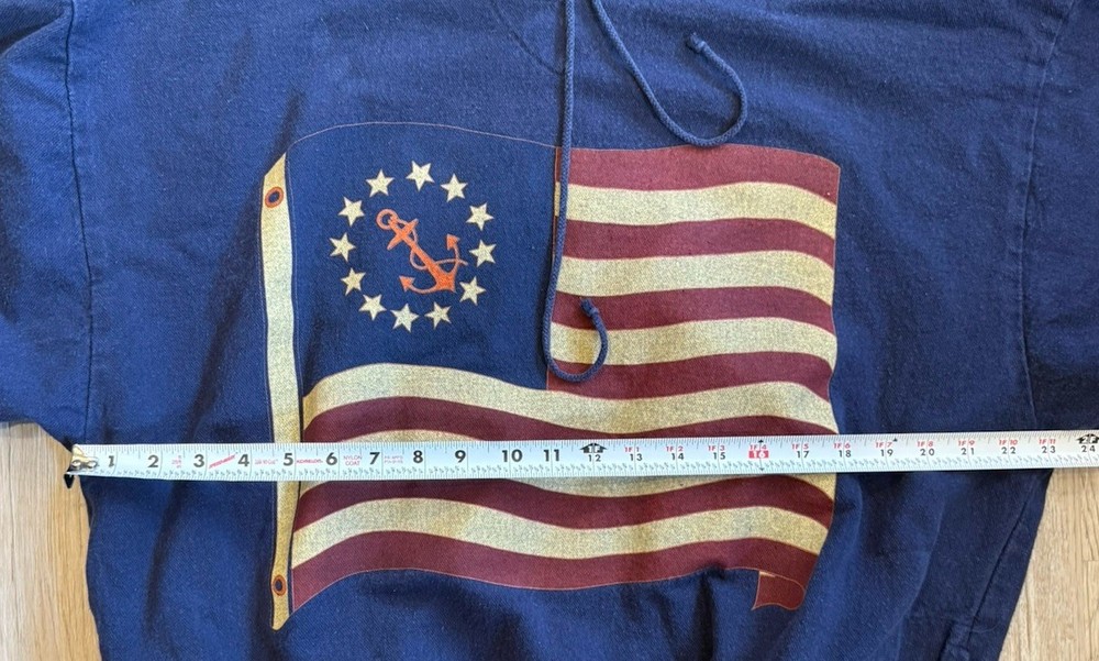The Vintage WEK The World Drawstring Sweatshirt in Adult size L is a blue American Flag themed pullover made of denim fabric with a relaxed fit. It features a V-neckline, logo accents, graphic print, and pockets, suitable for all seasons. This heavyweight sweatshirt is machine washable and perfect for those who appreciate vintage fashion with a hint of USA patriotism and 90s nostalgia.
