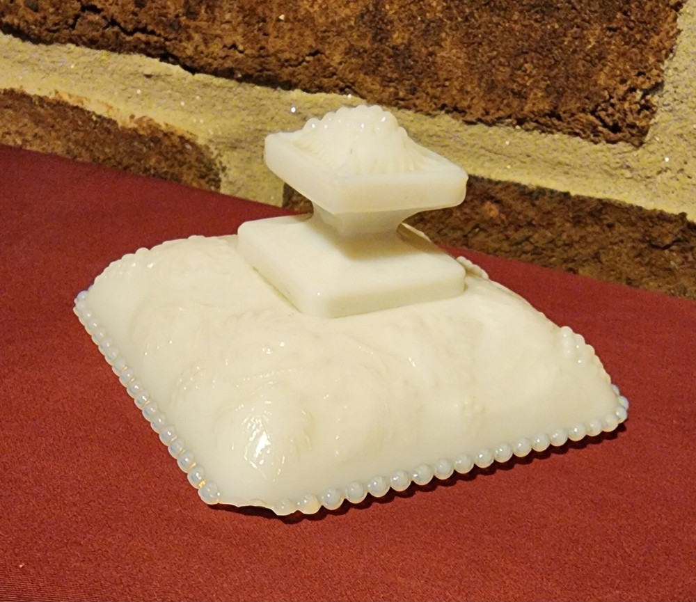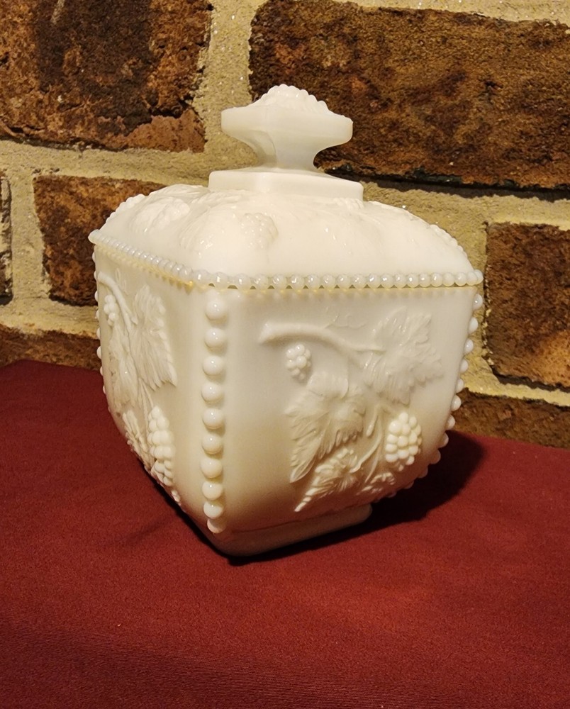 Vintage WESTMORELAND White Milk Glass Candy Dish with Lid - Grape Vine Pattern: small chip in lid