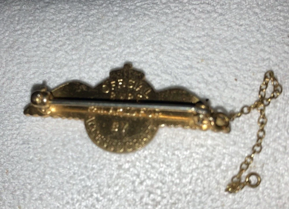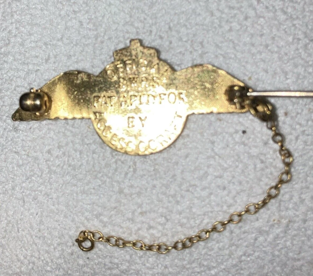 Vintage WWII RAF Pilot Wing PIN British War Relief Society Accessocraft The British War Relief Society (BWRS) played a crucial role during the early years of World War II by providing non-military aid to people in Great Britain . The BWRS, founded in 1939 acted as an umbrella organization coordinating the efforts of various grassroots groups in the United States. Its mission was to supply essential aid such as food, clothing, medical supplies, and financial assistance to the British population during the war. The Royal Air Force (RAF) played a heroic role during the war and i nspired by the RAF’s success, the BWRS produced wing pins that were sold to further the effort. Here is one of those pins. Gold tone metal with blue and red enameling. Back states: Official BWRS Pat. Apld for by Accessocraft. Has a short chain attached with a locking clasp on the pin. Measures about 1 5/8" x 5/8". Has been pre-enjoyed and in very nice condition with no tarnish or color loss. Please feel free to ask questions and take a look at my other items to combine shipments and save on postage cost. Shipping in US only.