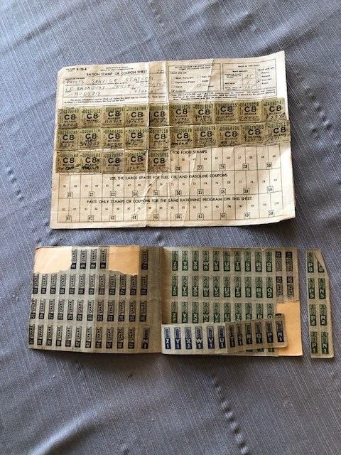 WWII Ration Book Four & Coupon Sheet - issued August 1943. Jersey City, NJ addresses. Includes some unused stamps. A truly historical item...from a time when Americans were all united for one purpose, unlike now when everyone can't agree whether it's day or night.