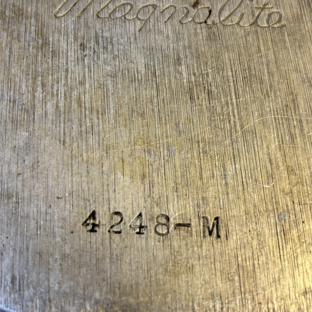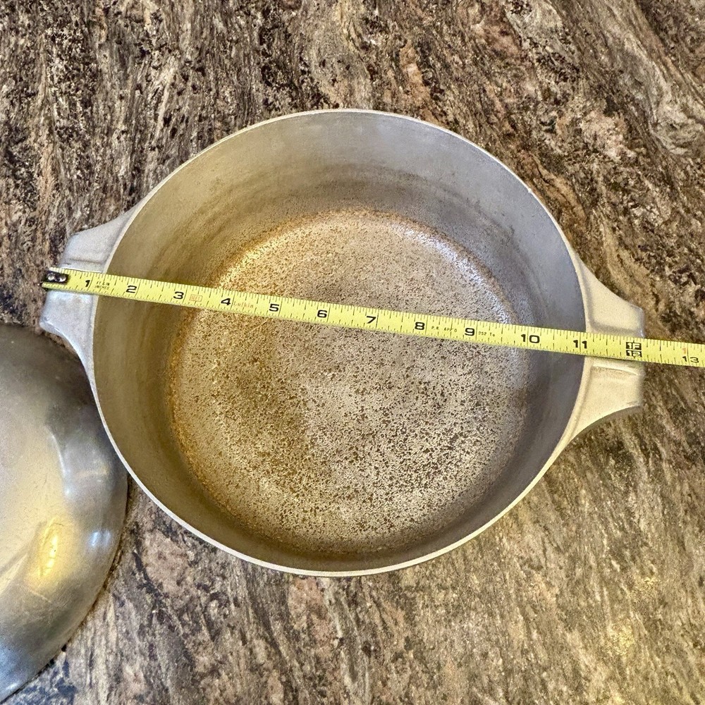 The Vintage Wagner Ware Sidney O Magnalite 4248-m Dutch Oven Stock Pot with Lid is a classic two-piece set that includes a round, silver Dutch oven with a 12" diameter and 8" height, boasting a capacity of 5 QT. Made of durable cast aluminum, this original piece from the United States features a lid for added convenience. Perfect for use on both electric and gas stoves, this vintage collectible cookware item is a timeless addition to any kitchen, ideal for cooking a variety of dishes.