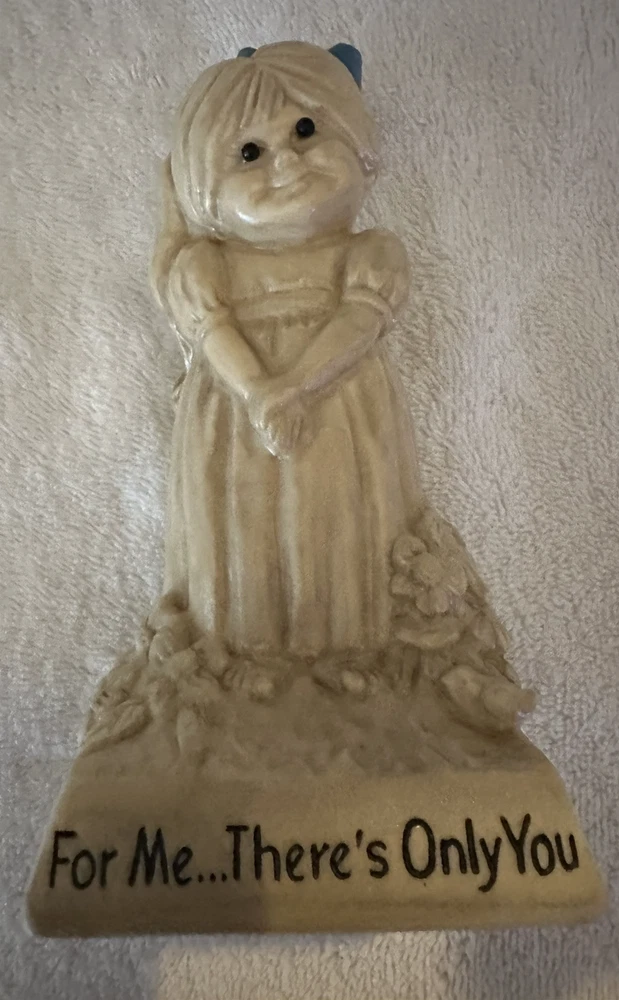 This vintage Wallace & Russ Berries 1971 figurine features a girl with a matte finish, made of beige plastic in the 1970s style. The figurine is part of the Love collection and depicts the message ''For Me... There's only you.'' With a simple design and sentimental subject, this piece would be suitable for all occasions and could be a charming addition to a decorative collectibles display.