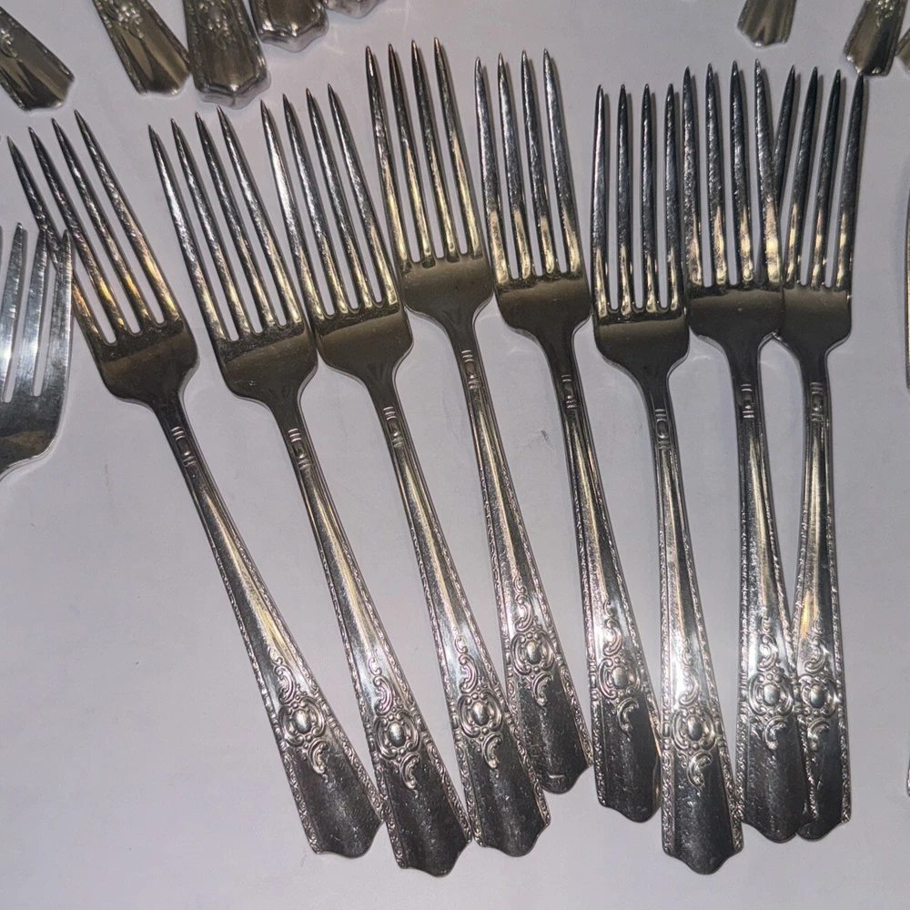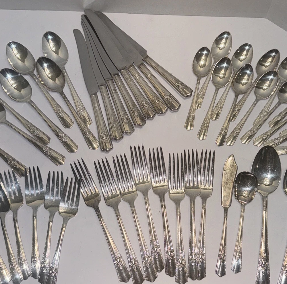 Elevate your dining experience with this vintage Harmony House Maytime flatware set. The set includes 51 pieces of flatware, each with a beautiful Maytime handle pattern. With a mid-century modern style, madder in 1944 according to replacements.Com 8 knives 8 dinner forks 8 salad forks 8 soup spoons 8 teaspoons 7 dessert spoons Butter knife Sugar spoon 2 servings spoons Please feel free to contact me with any questions you have