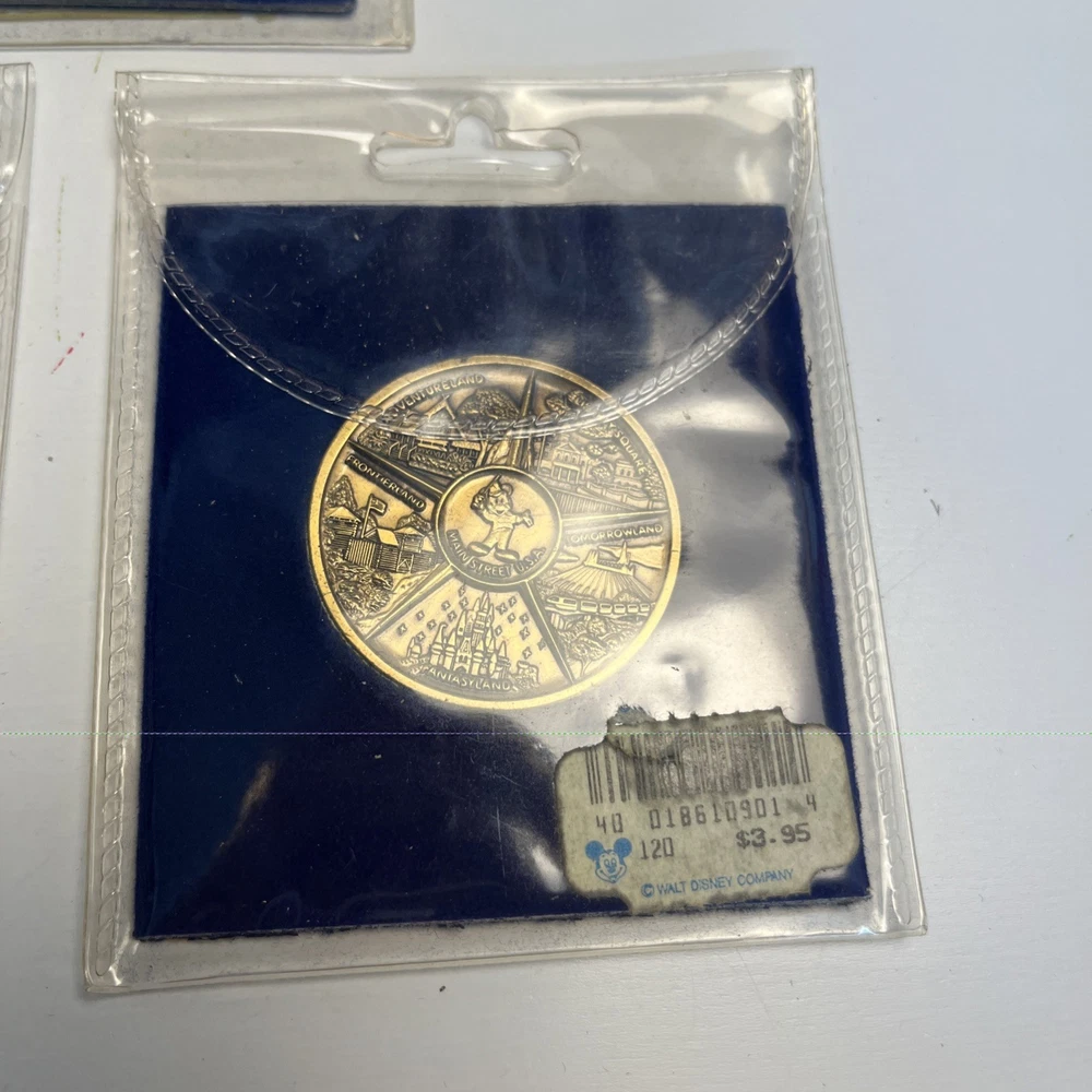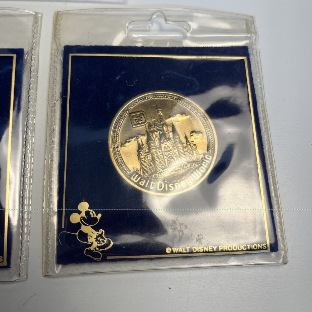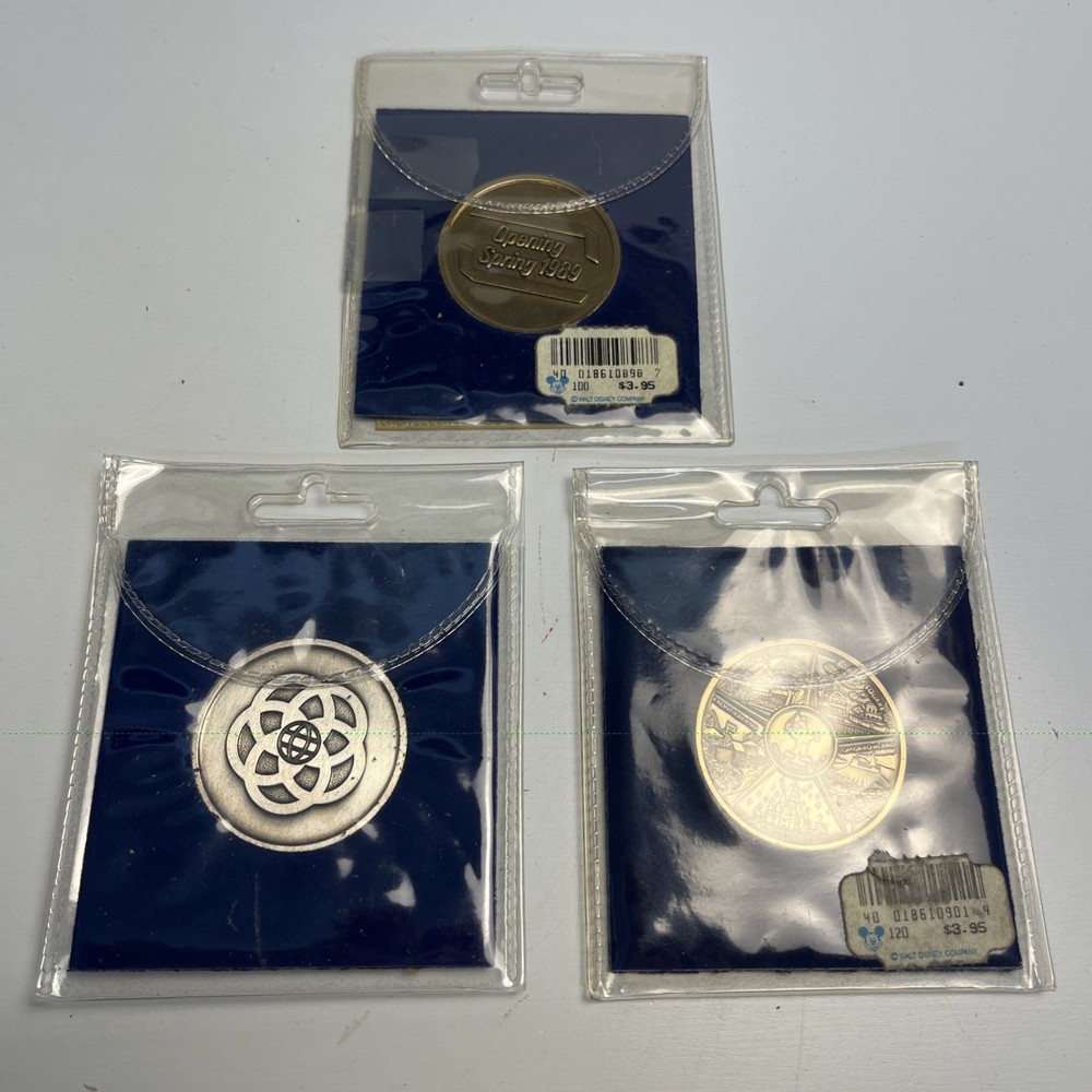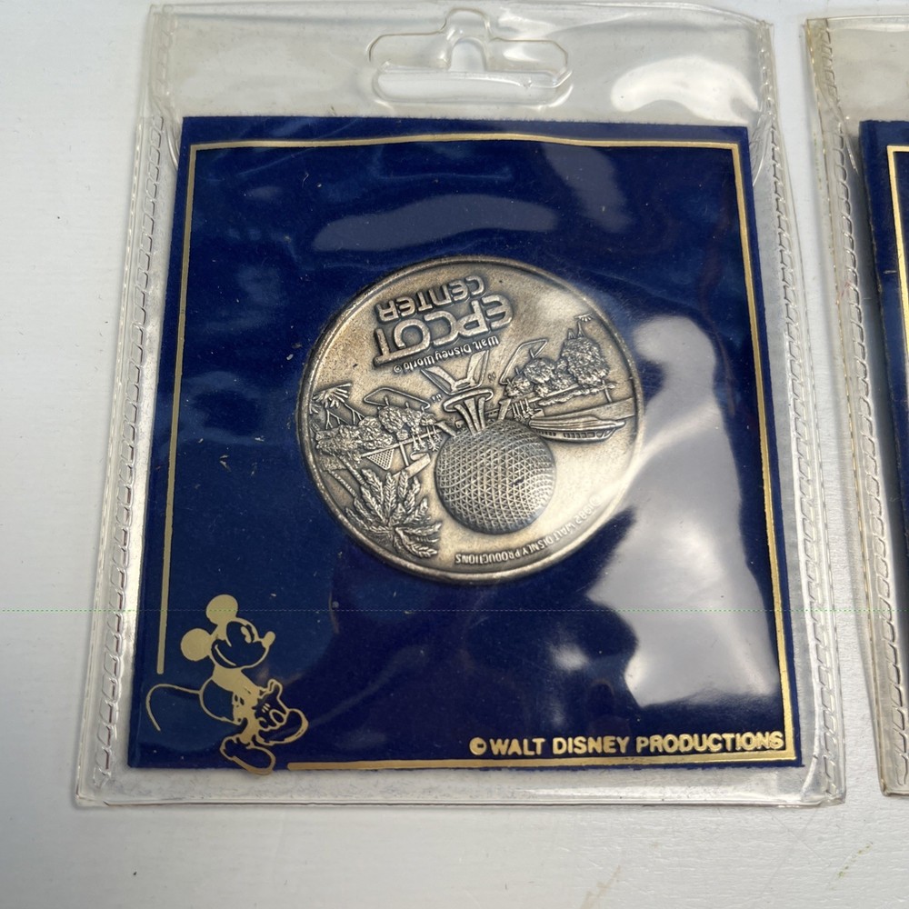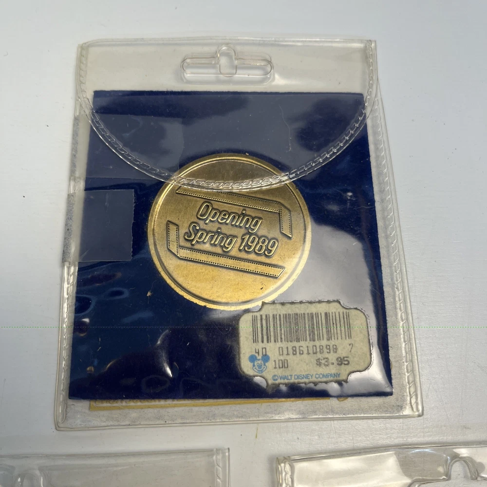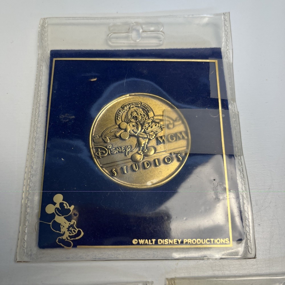 Group of three vintage Walt Disney World commemorative coin–style pieces. Includes one marked Walt Disney World Epcot Center 1982, one marked Disney MGM Studios Opening Spring 1989, and one marked Walt Disney World Main Street USA. The Main Street USA piece is not dated, but appears to be from the same general era based on the original packaging style. All three are housed in their original Walt Disney Productions branded plastic display sleeves. These are souvenir commemoratives and are not legal tender. ⸻ Condition Preowned. Coins show light surface wear consistent with age and handling. Original plastic display sleeves are present on all three but show yellowing and age-related wear - one has some tape on it. Graphics and details remain clear. Please review photos for exact condition.