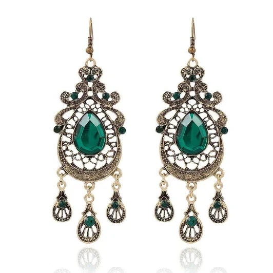 Vintage Water Drop Dangle Green Crystal Earrings • Retro Palace Style Earrings • Long Drop Earrings • Closure: beagle Stone: Crystal Stone color: green Finish: antique gold Size: 93 x 28 mm Specifications: Geometric pattern and multiple irregular shapes, so special and unique. Crystal decored, so charmful and delicate. matching with your dress, skirts, T-shirts and most of your costumes. A very good gift for yourself and someone special. Suitable for going wedding party or banquet. Condition: New and high quality. Package Content:1 Earrings