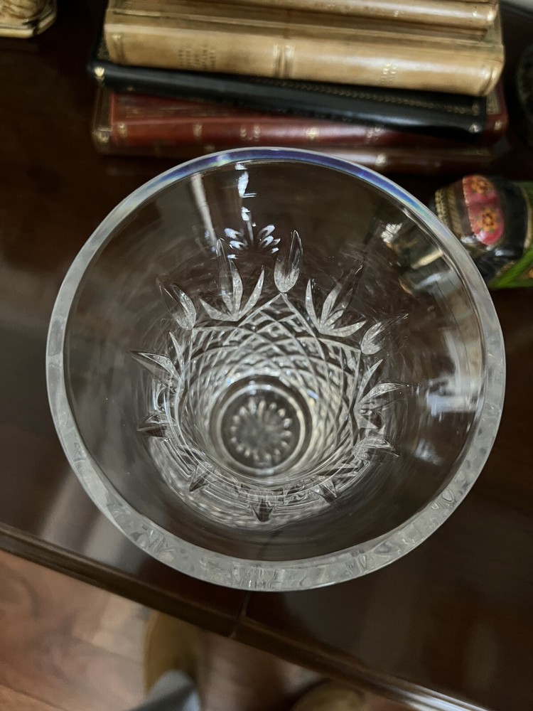 This vintage Waterford crystal vase is a true gem for any collector or lover of decorative pieces. With its intricate design and flared pedestal base, it is sure to catch the eye and add elegance to any room. Made in Ireland, this vase is crafted from high-quality crystal and is in excellent condition, ready to be displayed or used to add beauty to your home decor. The vase measures 8 1/2" in height and is perfect for displaying flowers or other decorative items. Add a touch of sophistication to your collection with this exquisite Waterford crystal vase.